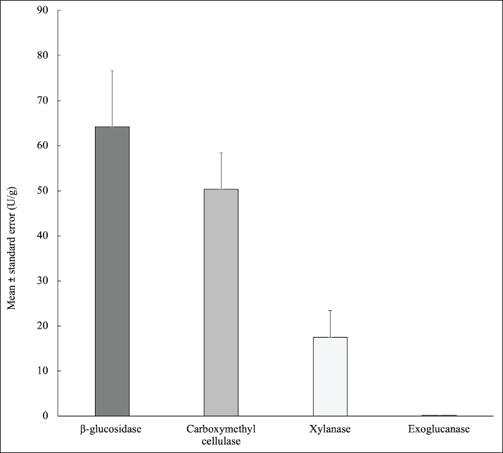 The study found that the buffalo ruminal microbiota secreted the enzymes carboxymethyl cellulase, exoglucanase, xylanase, and beta-glucosidase (Fig. 2). The highest enzyme activity in the buffalo rumen was β-glucosidase (64.23 ± 12.37 U/g). Carboxymethyl cellulase, xylanase, and exoglucanase contents were 50.36 ± 8.05, 17.44 ± 5.95, and 0.20 ± 0.03 U/g, respectively.