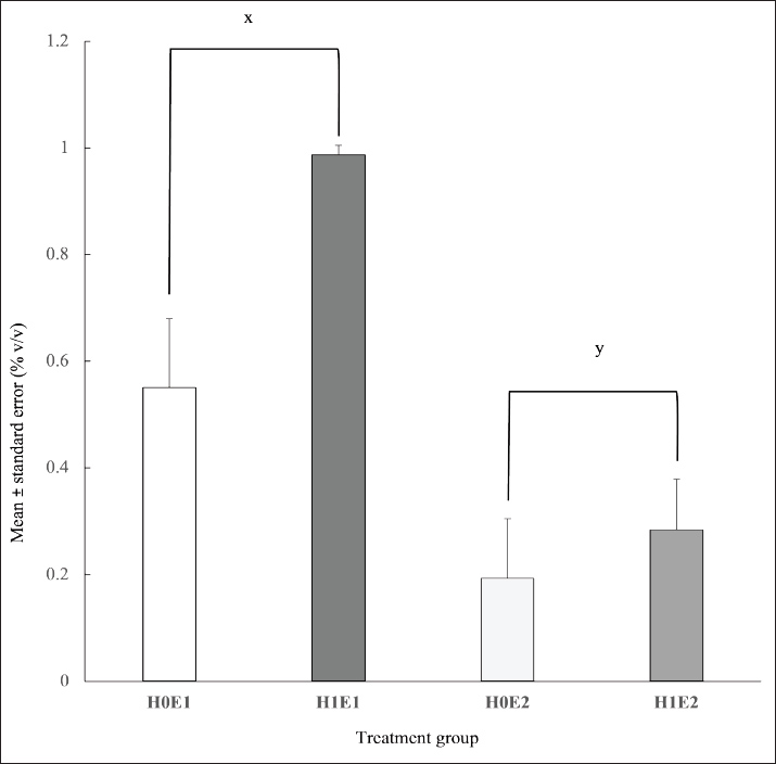 The interaction treatments impacted (p < 0.01) the glucose production (Fig. 3). H1E1 treatment had the highest glucose content (193.94 ± 14.51 g/L) among all treatments. Moreover, the glucose level in the H0E1 group was higher than that in the H0E2 and H1E2 groups (102.96 ± 27.59 vs. 0.91 ± 0.15 and 1.32 ± 0.37 g/L, respectively). The combination treatments had no effect (p > 0.05) on ethanol production (Fig. 4).. Heat treatment did not (p > 0.05) influence the ethanol content. However, enzyme treatment affected (p < 0.01) the ethanol level. The ethanol production in the H0E1 and H1E1 groups (0.55% ± 0.13% and 0.99% ± 0.02% v/v) was higher than the ethanol content in the H0E2 and H1E2 treatments (0.19% ± 0.11% and 0.28% ± 0.10% v/v).