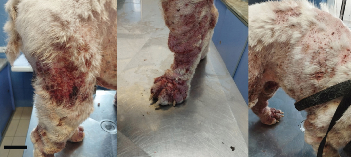 Fig. 2. The dog with clinical symptoms of deep pyoderma. Scale bar=5 cm