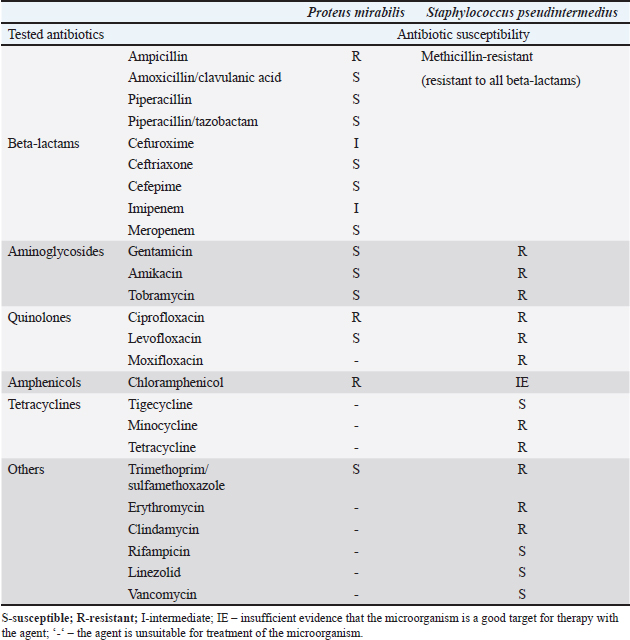 Staphylococcus pseudintermedius is the most commonly isolated pathogen in canine skin infections and otitis externa (Priyantha, 2020). According to a recent meta-analysis, S. pseudintermedius was detected in 78.9% of the samples, whereas P. mirabilis was detected in 16.3% (Tanveer et al., 2024). In a study from South Africa (Prior et al., 2022), it was detected in 83.8% of the samples. The majority of them (85.9%) were methicillin-resistant (Prior et al., 2022). We found a case report of canine pyoderma caused by S. pseudintermedius and P. mirabilis with competitive resolution in the literature. Notably, the diagnosis was superficial pyoredma, not deep pyoderma (Jeong and Oh, 2011). In another case report, P. mirabilis caused deep sheep pyoderma at an injection site. The treatment was again successful (Abdollahi et al., 2022). In a study conducted in Hong Kong that involved 63 clinical isolates of canine pyoderma, S. pseudintermedius emerged as the most prevalent species. Furthermore, Proteus spp. were detected in 8.2% of the samples, suggesting that they are significant pathogens associated with pyoderma (Chan et al., 2025). In accordance with the reported cases, there were challenges in both microbiological diagnostics and treatment, highlighting the importance of coinfections and the need for testing antibiotic susceptibility.
