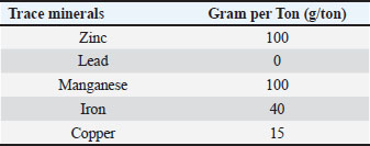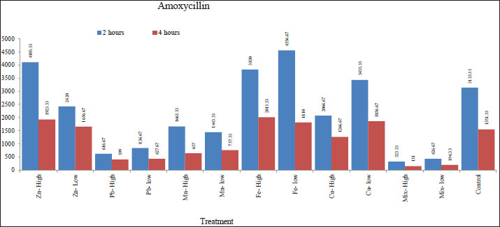 Effect of metals in drinking water on the bioavailability of oxytetracycline and amoxicillinThe results (Table 5 and Fig. 1) showed that the water treated with low levels of Zn, Pb, Mn, and Cu, and high levels of Zn and Pb resulted in a significant (p < 0.001) increase in the Cmax of oxytetracycline after 2 hours of treatment as compared with the control group. In addition, a low level of the mixture and high levels of Fe, Cu, and mixture resulted in a significant (p < 0.001) decrease in the Cmax of oxytetracycline after 2 hours of treatment in comparison with the control group. On the other hand, no significant differences were found among the control and low level of Fe and high level of Mn. Table 5. Effect of metals on the bioavailability of oxytetracycline and amoxicillin.