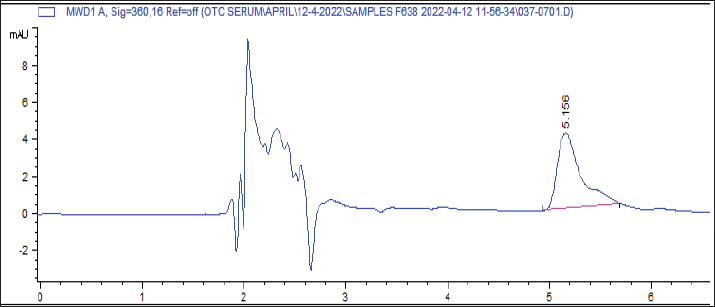 Evaluation of the efficiency of oxytetracycline and amoxicillinReagents and chemicalsAcetonitrile and acetic acid were obtained from (Merck®, Nogent-Sur-Marne, France), methanol) Sigma® -Aldrich, Co. Steinheim, Germany), HPLC system grade water. Reference standardsThe active pharmaceutical ingredients (API) including oxytetracycline (Bio-Basic, Canada Inc. USA) and amoxicillin (Merck Sharp and Dohme, Rahway, N.J.) were used as reference standards without further purification with concentrations levels of (100, 250, 500, 1,000, 5,000, and 10,000 ppb) for oxytetracycline and (250, 500, 1,000, 2,500, 5,000, and 10,000 ppb) for amoxicillin. Apparatus and instrumentsHigh-performance liquid chromatographic systemHPLC system comprised an iso pump, a water solvent delivery system, and a manual injector (rheodyne) attached with a 20 μl loop, equipped with an injection valve (Rheodyne® model 7125) with a 20 μl fixed loop and a variable ultraviolet detector (Varian® model 4000) as well as a Waters fluorescent detector (model 420). The system was controlled by the ChemStation software (Hewlett-Packard, Les Ulis, Germany). 0.45 μm pore size Millipore Millex®—HV filter units, Saint Quentin Yvelines, France, a reversed-phase column (C18, Zorbax column, 250 mm, 4.6 mm i.d., 5 µm—Agilent Co., USA), Bond Elute C18 (500 mg, 3 or 6 ml; Varian, Les Ulis, France. It was carried out in the Residue Analysis Unit, Reference Laboratory for Veterinary Quality Control on Poultry Production, Animal Health Research Institute, Egypt, using HPLC to measure the maximum or peak serum concentration Cmax of antibiotics in the samples as described in the literature (Morton et al., 1986). Briefly, HPLC analysis was performed using an ultraviolet detector at 280 wavelengths and adjusted its flow rate at 1 ml/minute during sample injection with a rheodyne syringe loading sample injector at an Injection volume of 25 μl. The run time for each sample is ± 25 minutes. All the analyses were carried out at room temperature, where a reversed-phase column was used. The mobile phase for HPLC analysis was prepared by adding 50 ml acetic acid 5% to 950 ml deionized HPLC-grade water to form a volume of 1 l, then removing 100 ml from the solution and adding a mixture of 50 ml methanol and 50 ml acetonitrile were added. The mobile phase was filtered using a membrane filter (Saint Quentin Yvelines, France) and then degassed before its use. It was allowed to stabilize for at least 2 days and stored at 4°C. All solutions and solvents were filtered using the membrane filter and degassed before use. Standard and spike solutions preparationThe API, including oxytetracycline (Bio-Basic, Canada Inc. USA) and amoxicillin (Merck Sharp and Dohme, Rahway, N.J.) were used as reference standards without further purification at different concentration levels (100, 250, 500, 1,000, 5,000, and 10,000 ppb for oxytetracycline & 250, 500, 1,000, 2,500, 5,000, and 10,000 ppb for amoxicillin). Spike solutions were prepared by dissolving oxytetracycline or amoxicillin in sterile deionized water. The solutions were diluted in heat-inactivated pooled serum of normal chickens for standards with concentrations of (100, 250, 500, 1,000, 5,000, and 10,000 ppb) for oxytetracycline and (250, 500, 1,000, 2,500, 5,000, and 10,000 ppb) for amoxicillin. Sample preparationSample preparation for HPLC required the addition of 0.2 ml of methanol for the precipitation of protein, followed by 30 seconds of vortex mixing and centrifuging at 5.500 × g for 10 minutes. The supernatants were taken out and filtered through a membrane filter. The filtrates were employed for the analysis. Standards, spikes, and samples were preserved at −70°C till analysis. Calibration curvesSix different concentration levels (100, 250, 500, 1,000, 5,000, and 10,000 ppb) and (250, 500, 1,000, 2,500, 5,000, and 10,000 ppb) were obtained from oxytetracycline and amoxicillin standard solution, respectively, and diluted with the mobile phase. Each of the solutions was injected into the chromatographic system. The mean values of the peak areas were plotted against their concentrations. The curves were adjusted using linear regression with the method of least mean square (Hewlett-Packard, Les Ulis, Germany). Also, three different concentration levels (75, 750, and 1,500 ppb) and (2,000) of oxytetracycline and amoxicillin spikes solution, respectively, were obtained and diluted with the mobile phase. Each of the solutions was injected into the chromatographic system. The mean values of the peak areas were plotted against their concentrations. QuantificationQuantification of antibiotics (oxytetracycline and amoxicillin) in the samples was obtained and calculated from the area under the curves extrapolated automatically by the software. Formula: y=mx + b m: 3.93337 e-2 x: Amount b: 4.68869 e-1 y: Height of the peak Linearity and rangeThe evaluation of the linearity of the proposed method was done by preparing at a minimum of 5 different concentrations of the antibiotic standard and using calibration curves to estimate the intercept and coefficient of correlation values. Where linearity was defined using the squared correlation coefficient (r2). According to the International Council for Harmonization (ICH), it should be 0.99. Method precisionSix replicates of the standard solutions (oxytetracycline amoxicillin) were used. Acceptance criteria: RSD ≤ 1%, according to ICH. Criteria: RSD ≤ 1%, according to ICH. Accuracy and recoveryThe chickens’ serum samples were spiked with the addition of known quantities of each standard. The samples were analyzed against similar concentrations of the standard solutions. The accuracy was estimated from the results as a percentage (%) recovery. Statistical analysisData are presented at mean ± standard error (SD). The obtained data were statistically analyzed according to (SAS Institute Inc, 2002). The results were analyzed using one-way ANOVA. Values with