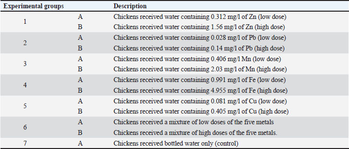 Animal groupingThe animal study involved 234 chickens divided into 6 broad groups (each group containing subgroups A and B as low dose and high dose, respectively). There were 18 Chickens in each subgroup. Chickens in subgroup A received water containing the maximum level of heavy metals (low dose) while chickens in group B received water containing 5 × of the A subgroup (high dose). The control group was given bottled water from a water company in the Qassim region without adding heavy metals. The description of experimental groups is shown in Table 2. Table 2. Description of the experimental groups of reared broiler chickens.