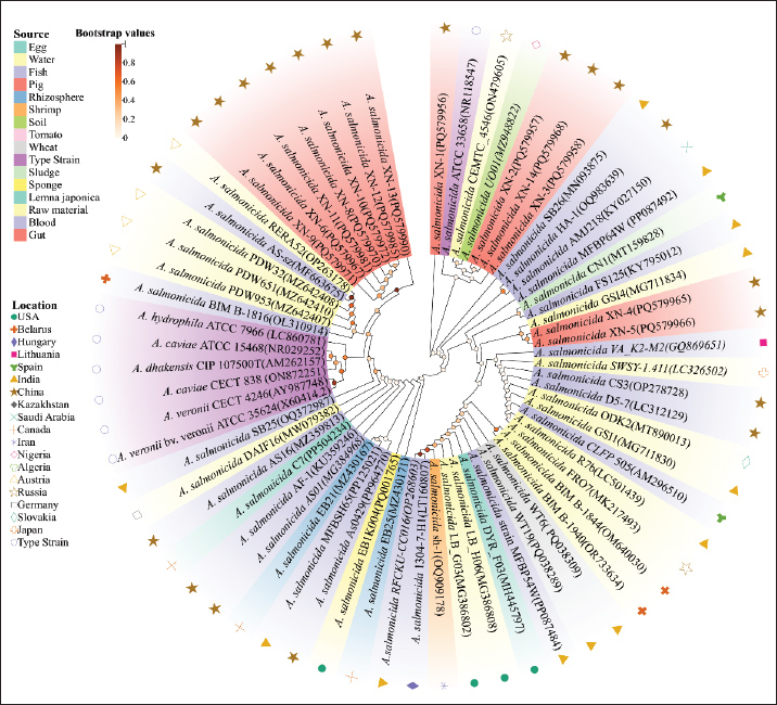 Fig. 1. Phylogenetic tree based on the 16S rRNA sequences of the isolates and selected species. The phylogenetic tree comprised 60 strains of A. salmonicida and 6 closely related quality control (QC) strains. Among the A. salmonicida strains, 13 were experimental isolates obtained from Jilin Province, China, one was the reference strain A. salmonicida ATCC 33658, and the remaining 46 were derived from 16S rRNA sequences of A. salmonicida isolated from various species in disparate areas, sourced from the NCBI database. The leaf color indicates the isolated species of the strains. The circles on the branches are colored to show the bootstrap values. The symbols in the outermost circle indicate the region from which the strains were isolated.