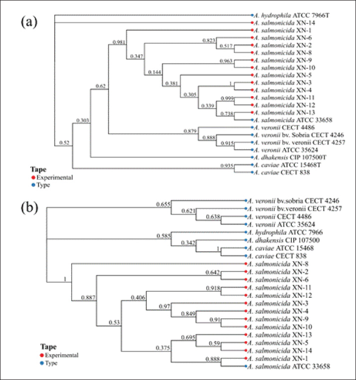 Fig. 2. Phylogenetic analysis of A. salmonicida and closely related species based on housekeeping genes. (a) Neighbor-joining tree reconstructed from gyrB gene sequences. (b) Neighbor-joining tree reconstructed from rpoB gene sequences. Both trees included 13 experimental strains (red symbols), the A. salmonicida QC strain ATCC 33658 (blue symbol), and six closely related species (blue symbols). The numbers at the nodes represent bootstrap values. The symbols preceding the strain names denote the strain type: experimental (red) and quality control (QC)/reference (blue) strains.