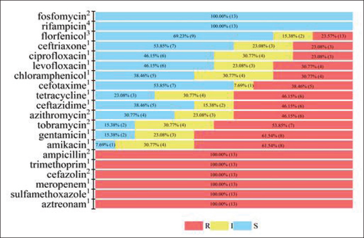 Fig. 4. Resistance rates of A. salmonicida to 20 antibiotics This graph presents the resistance profile of 13 strains of A. salmonicida, isolated from pig farms in Jilin Province, China, to 20 antibiotics. Before performing the MIC test, each isolate was subcultured in fresh BHI broth and incubated at 37°C for 12 hours. Antimicrobial susceptibility testing was performed using the agar dilution method on MHA. The QC strain was E. coli ATCC 25922. Red, resistance; yellow, intermediary; and blue, sensitive. The numerical value within the brackets represents the specific region identifier. The following corner markers illustrate the methodology for identifying the MIC inflection point: 1: M45 (CLSI, 2016, Aeromonas spp.); 2: M100 (CLSI, 2023, Enterobacterales); 3: M42 (CLSI, 2011, Aeromonas salmonicida); 4: (Esteve et al., 2012). To further screen for carbapenemase production phenotypically, the modified Carbapenem Inactivation Method (mCIM) was performed on all 13 experimental A. salmonicida isolates, following the guidelines outlined in CLSI M100 (33th ed., 2023). Briefly, a 1 μl loopful of bacteria from an overnight culture on sheep blood agar was emulsified in 2 ml of tryptic soy broth for each isolate. A 10 μg meropenem disk was then immersed in the bacterial suspension. After incubation at 37°C for 4 hours, the disk was retrieved and placed onto an MHA plate seeded with the meropenem-susceptible E. coli ATCC 25922 indicator strain. The inhibition zone around the disk was measured after an additional 18 hours of incubation at 37°C. All tests were performed in triplicate to ensure reproducibility. Second-generation sequencing analysisBacterial cultures were maintained under controlled incubation conditions until the logarithmic growth phase was achieved. We subjected the cell culture media to centrifugation at 7,000 rpm for 15 minutes to prepare them. The quality of the extracted DNA was verified using a NanoDrop spectrophotometer (A260/A280 ratios between 1.8 and 2.0) and 1% agarose gel electrophoresis. Qualified DNA samples were subjected to library preparation using the TrueLib DNA Library Rapid Prep Kit for Illumina (Yitaike Biotech Co., Ltd.) and subsequently submitted to Bemac Biotechnology Co. (Qingdao, China) for Illumina sequencing, which generated an average sequencing depth of 100× per genome. Raw sequencing reads were processed using fastp (version 0.23.2) to remove adapters and low-quality bases with the following parameters: -Q -y -g -Y 10 -l 100 -b 150 -B 150 (Haibin et al., 2012). Subsequently, reads were further filtered using fastq_filter_by_Qxx to retain only high-quality sequences with a minimum Q30 score threshold of 85% over a 30-bp sliding window (-q 0.85 -w 30). For genome assembly, the filtered reads were assembled using the Spades v3.6.2 software (Prjibelski et al., 2020). The assembly quality was assessed based on the contig N50 values. Furthermore, antibiotic resistance genes were identified using the Resistance Gene Identifier tool (Web portal version 6.0.5) against the Comprehensive Antibiotic Resistance Database (CARD, version 4.0.1). The analysis involved the following steps and criteria: Open Reading Frames were first predicted from the input DNA sequences using Prodigal; homolog detection was then conducted using DIAMOND. The results were filtered to include only "Perfect" and "Strict" ('Perfect' requires all amino acids to match the CARD reference and “Strict” requires a bitscore of ≥500) hits. The presence/absence of Antibiotic Resistance Genes was summarized into a binary matrix and used to construct a dendrogram illustrating strain clustering based on ARG profile similarity. Clustering analysis and visualization were performed in Origin 2024 using the UPGMA and Euclidean distance, with both circular and radial dendrogram layouts applied to visualize natural grouping patterns. Ethical approvalVerbal consent was obtained from the farm manager prior to sample collection, nasal swab samples were collected from pigs exhibiting mild respiratory symptoms by veterinarians. The sampling method was non-invasive and strictly adhered to animal welfare guidelines, ensuring that any potential distress to the animals was minimized. The study was approved by the Institutional Animal Ethics Committee of Jilin Agricultural Science and Technology College (Reference number: LLSC202301055), with an approved project period from January 2023 to December 2024. All procedures performed on the animals followed the ethical standards of the institution. ResultsIdentification and phylogenetic analysis of isolates of A. salmonicidaSequencing data were analyzed using the Basic Local Alignment Search Tool (BLAST) on the NCBI platform. The initial taxonomic identification of all 13 strains was confirmed by 16S rRNA gene sequencing, which revealed >99.00% sequence identity with A. salmonicida reference sequences. To further validate this identification, we performed multilocus sequence typing (MLST) based on the second-generation sequencing data of the 13 experimental strains using the PubMLST database. All strains were unequivocally assigned as A. salmonicida using the MLST scheme, thereby consolidating the initial BLAST-based identification. Phylogenetic analysis based on 16S rRNA gene sequences was conducted using a dataset of 66 strains, including 13 porcine-derived A. salmonicida experimental isolates, the standard strain A. salmonicida ATCC 33568, 46 A. salmonicida isolates from diverse geographical and host origins, and 6 standard strains of closely related species. The phylogenetic tree revealed distinct intraspecific clustering of the experimental strains into three major groups and one independent branch (Fig. 1; experimental isolates highlighted in red). Cluster I, comprising XN-6, XN-8, XN-9, XN-10, XN-11, XN-12, and XN-13 isolates, was strongly supported with a bootstrap value of 0.99. Cluster II, which consists of XN-4 and XN-5, received a moderate bootstrap