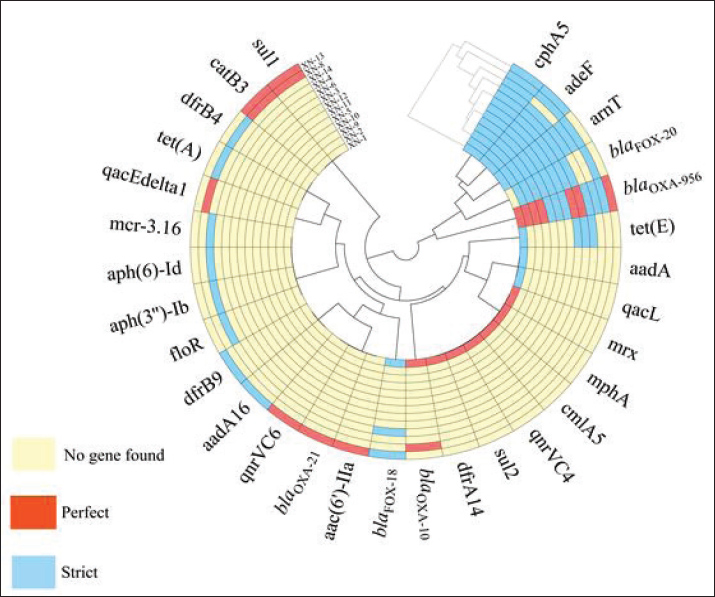 Fig. 5. Resistance genes of A. salmonicida in 13 isolates This figure shows the carriage of drug resistance genes in 13 A. salmonicida strains isolated from pigs in Jilin Province, China. Red, perfect resistance genes; blue, strict resistance genes; yellow, absence of resistance genes. The sequence number in parentheses following the strain number is the accession number of corresponding strain’s second-generation sequencing data. The angular branches were clustered using a circular dendrogram with the group average clustering method, Euclidean distance type, and a single cluster. The clustering along the radius is configured to utilize radial dendrograms, with the group average clustering method, the Euclidean distance type, and a single cluster. Table 2. Resistance gene profiles in 13 A. salmonicida strains detected using the CARD database.