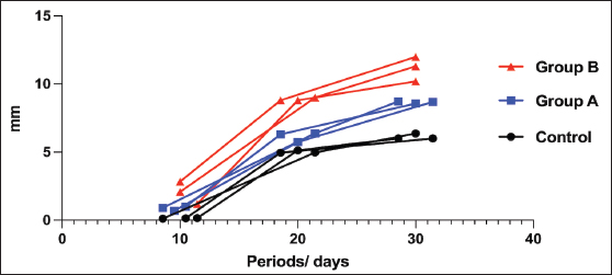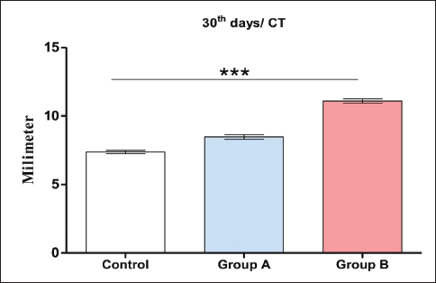 The results of this study have shown that there was a significant increase in the production of calluses in all groups except the control group. In the control group, the average degree of the callus thickness with their standard deviation on the 10th, 20th, and 30th days were 0.143 mm (±0.021 SD), 5.017 mm (±0.099 SD), and 6.127 mm (±0.211 SD), respectively. In this group, there was only a significant increase in the callus size between the 10th and 20th days of the operation, but this increase was not found from 20th to 30th day of the operation. Interestingly, a large number of calluses were produced in the treatment groups with significant differences between the different periods of the operation in groups A and B. There was a significant difference in the degree of postoperative callus formation between the treatment groups (A and B) and the control group. In group A, the average degree of the callus thickness with their standard deviation on the 10th, 20th, and 30th days were 0.867 mm (±0.153 SD), 6.143 mm (±0.351 SD), and 8.667 mm (±0.085 SD), respectively. In group B, the thickness of the callus with their standard deviation at the fractured site on the 10th, 20th, and 30th day, were 2.033 (±0.821 SD), 8.873 (±0.118 SD), and 11.16 mm (±0.908 SD), respectively. Statistically, using one-way analysis of variance, Kruskal–Wallis and Tukey’s multiple comparison tests with a p value (p < 0.05), we found a significant difference in the callus size in group B at the 10th, 20th, and 30th days compared with group A (Fig. 3).