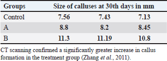 Table 2. Sizes of the calluses (mm) in the control, PRP group, and bone graft and PRP group) at 30th days post-operation on computed tomographic (CT) images.