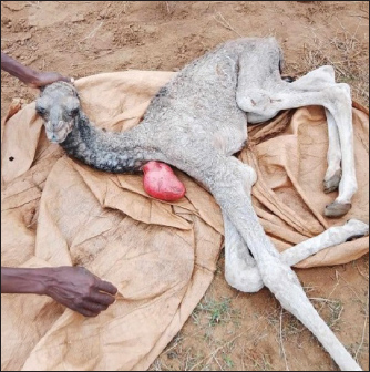 Fig. 2. Cervical ectopia cordis in a neonatal camel showing a visible protrusion at the neck base on the left side of the animal, North Kordofan, Sudan. Ethical approvalInformed consent was obtained from the owner of the animals to allow for the examination, photography, and use of images and videos for research and training purposes. DiscussionThis is the first reported instance of EC in dromedary camels. Heart conditions that affect camels include necrotic myocarditis, hypertrophic cardiomyopathy, vegetative valvular endocarditis, pericarditis, and congenital abnormalities such as septal anomalies, patent ductus arteriosus, transposition of the aorta and pulmonary artery, persistent aortic trunk, and persistent right aortic arch and sarcocystosis (Tharwat et al., 2012). EC is a rare congenital anomaly in veterinary medicine. The cardiac anomaly identified in this camel calf was classified as complete thoracic EC (TEC), similar to previously reported cases in cattle and sheep. This contrasts with the predominance of thoracoabdominal EC in cats, piglets, and dogs (Cerqueira et al., 2024). EC occurs in humans, appears seldom in cattle, dogs, rabbits, pigs, cats, and goats, and is very uncommon in sheep (Freeman and McGovern, 1984; Hiraga et al., 1993; Cerqueira et al., 2024). The condition can be categorized as cervical, thoracocervical, thoracic, thoracoabdominal, or abdominal based on the location of the ectopic heart. Depending on whether the heart is covered by a pericardial sac, it can also be categorized as partial or total (Cerqueira et al., 2024). Furthermore, there are two categories of EC: internal and external. In internal cases, the heart is displaced entirely into either the cervical or abdominal region, whereas in external cases, it protrudes outside the body, as observed in this instance. Animals with external EC typically do not survive for long, but those with internal EC can survive for extended periods. For example, there have been cases of cows with internal EC, including one that had a normal delivery and another that lived to the age of 14 years (Bowen and Adrian, 1962; Windberger et al., 1992). Additionally, Onda et al. (2011) reported a calf with cervical EC that not only grew normally but also became pregnant and successfully gave birth. In this report, the affected calf survived for 2 days after birth due to the supportive care provided by the owner, which included milking the mother and administering colostrum via bottle-feeding. The cause of death may have been cardiorespiratory complications and bacterial infections. EC generally has a poor prognosis; most cases result in death due to infection, hypoxemia, or heart failure (Bernstein, 2011). ConclusionThis case is the first documented instance of the EC in camels from Sudan and offers important information for veterinary literature on congenital anomalies. This study contributes to the understanding of this rare condition in dromedary camels, highlighting the need for increased awareness among veterinary practitioners and camel farmers in rural regions. Research is needed to explore the environmental conditions, parental history, and potential prenatal or perinatal factors that may have contributed to this anomaly in camels. AcknowledgmentsWe would like to express our gratitude to the owner of the affected camel, his family, and the rural community of Kerwo Al Umda village for reaching out to the first author and for their interest and cooperation. Conflict of interestThe authors declare that they have no competing interests. FundingNone. Authors’ contributionsJadkrem Jahlla Mohamed Ahmed visited the study area and investigated the case. Ahmed Mustafa, Ahmed Hussein, and Abdelmalik Ibrahim Khalafalla wrote the main text of the manuscript. All authors have reviewed and approved the final version of the manuscript. Data availabilityAll data were provided in the manuscript. ReferencesBernstein, D. 2011. Kliegman: nelson textbook of pediatrics. Elsevier Publishers, London, p. 1599. Bowen, J.M. and Adrian, R.W. 1962. Ectopia cordis in cattle. J. Am. Vet. Med. Assoc. 141, 1162–1167. Cerqueira, L.A., Mâcedo, I.L., Sousa, D.E.R., Amorim, H.A.L., Borges, J.R.J., Ximenes, F.H.B., Câmara, A.C.L. and Castro, M.B. 2024. Complete Thoracic Ectopia Cordis in Two Lambs. Animals. Open. Access. J. From. MDPI. 14(15), 2213; doi:10.3390/ani14152213 Engum, S.A. 2008. Embryology, sternal clefts, ectopia cordis, and Cantrell‘s pentalogy. Seminars. Pediatric. Surg. 17(3), 154–160; doi:10.1053/j.sempedsurg.2008.03.004 Freeman, L.E. and McGovern, P.T. 1984. Ectopia cordis thoracoabdominalis in a piglet. Vet. Rec. 115(17), 431–433; doi:10.1136/vr.115.17.431 Hiraga, T., Abe, M., Iwasa, K., Takehana, K. and Tanigaki, A. 1993. Cervical-pectoral ectopia cordis in two Holstein calves. Vet. Path. 30, 529–534; doi:10.1177/030098589303000606 Onda, K., Sugiyama, M., Niho, K., Sato, R., Arai, S., Kaneko, K., Ito, S., Muto, M., Suganuma, T., Wakao, Y. and Wada, Y. 2011. Long-term survival of a cow with cervical ectopia cordis. Can. Vet. J.=La Revue Veterinaire Canadienne 52(6), 667–669. Sadłecki, P., Krekora, M., Krasomski, G., Walentowicz-Sadłecka, M., Grabiec, M., Moll, J. and Respondek-Liberska, M. 2011. Prenatally evolving ectopia cordis with successful surgical treatment. Fetal Diagnosis Therapy 30(1), 70–72; doi:10.1159/000326300 Shone, J.D. and Funderburk. 1974. Ectopia cordis in a dog. J. Am. Vet. Med. Assoc. 165(1), 69–70. Tharwat, M., Al-Sobayil, F., Ali, A. and Buczinski, S. 2012. Echocardiography of the normal camel (Camelus dromedaries) heart: technique and cardiac dimensions. BMC Vet. Res. 8, 130; doi:10.1186/1746-6148-8-130 Windberger, U., Forstenpointner, G., Grabenwöger, F., Kopp, E., Künzel, W., Mayr, B., Pernthaner, A., Simon, P. and Losert, U. 1992. Cardiac function, morphology and chromosomal aberrations in a calf with ectopia cordis cervicalis. Zentralblatt Fur. Veterinarmedizin. Reihe A 39(10), 759–7