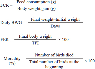 Using the CEVAC BIL, the experimental chicks were immunized against Newcastle Disease and Infectious Bronchitis. The CEVAC IBDL was used to vaccinate them against Infectious Bursal Diseases, in accordance with the guidelines provided by the manufacturer (Ceva-phylaxia Veterinary Biologicals Co. Ltd., Hungary). According to Akter et al., (2023) recommendations, each of the management techniques has been carried out for rearing AA broiler. Data collection and experimental procedureDetermination of growth performanceThe chicks’ initial live weights were recorded at the commencement of the investigation using an electronic weighing scale (Model: HESA 3303). We conducted a weekly analysis of the final body weight (FBW), body weight gain (BWG), feed intake (FI), feed conversion ratio (FCR), feed efficiency ratio (FER), and mortality of broiler throughout the course of the investigation following the study (Hossain et al., 2025; Imranuzzaman et al., 2025; Rahman et al., 2025). FBW gain=Final body weight − Initial body weight Total FI=Total feed supplied – Feed refusal