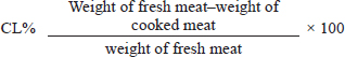 The internal temperature of the meat was measured using a digital needle-tipped thermometer (H 1145, Hanna Instruments, Padova, Italy). The following formula by Vargas-Ramella et al. (2022) was used to determine the cooking loss (CL):