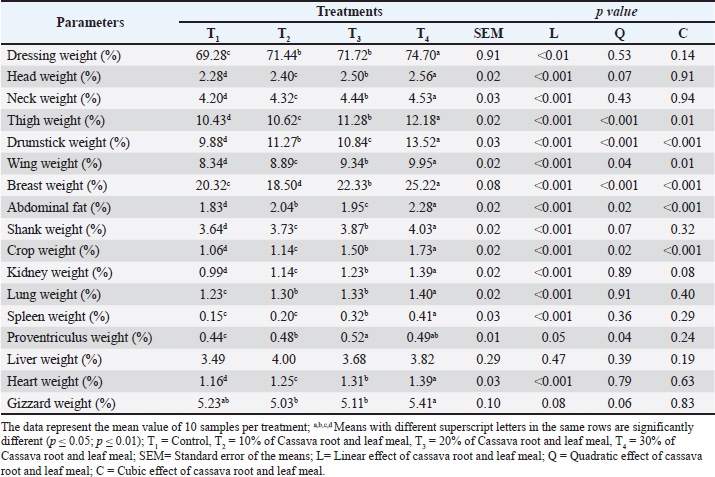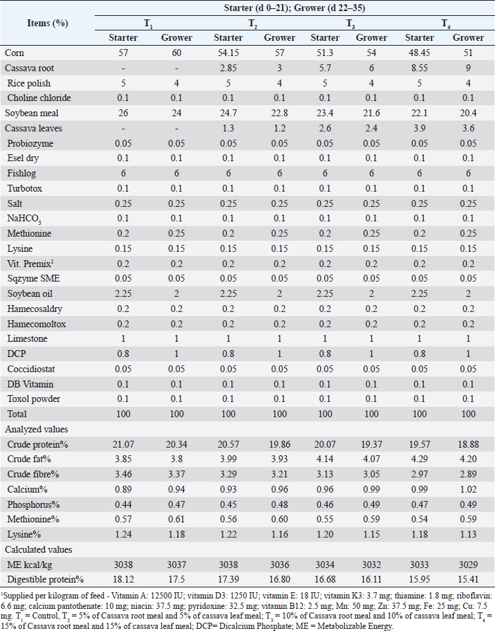 Open Vet. J.. 2026; 16(1): 560-576 Open Veterinary Journal, (2026), Vol. 16(1): 560-576 Research Article Cassava root and leaf meal as alternatives to energy and protein sources in broiler diets: Impacts on growth, carcass traits, blood biochemistry, meat qualityShahabuddin Ahmed1,2, Hemayet Hossain3, Md. Taslim Hossain1, Shaolin Ferdouse1, Asraful Alam2, Dipankar Sardar4, Md. Alauddin5,6, Md. Mahfujur Rahman7 and Mrityunjoy Biswas2*1Department of Animal Nutrition, Faculty of Veterinary, Animal and Biomedical Sciences, Khulna Agricultural University, Khulna, Bangladesh 2Department of Agro Product Processing Technology, Jashore University of Science and Technology, Jashore, Bangladesh 3Department of Anatomy & Histology, Sylhet Agricultural University, Sylhet, Bangladesh 4Biotechnology and Genetic Engineering Discipline, Khulna University, Khulna, Bangladesh 5Department of Nutrition and Food Technology, Faculty of Applied Science and Technology, Jashore University of Science and Technology, Jashore, Bangladesh 6Department of Biochemistry and Molecular Biology, Faculty of Biological Science and Technology, Jashore University of Science and Technology, Jashore, Bangladesh 7Department of Medicine, Sylhet Agricultural University, Sylhet, Bangladesh *Corresponding Author: Mrityunjoy Biswas. Department of Agro Product Processing Technology, Jashore University of Science and Technology, Jashore, Bangladesh. Email: mrityunjoy_appt [at] just.edu.bd Submitted: 12/08/2025 Revised: 11/11/2025 Accepted: 05/12/2025 Published: 31/01/2026 © 2025 Open Veterinary Journal