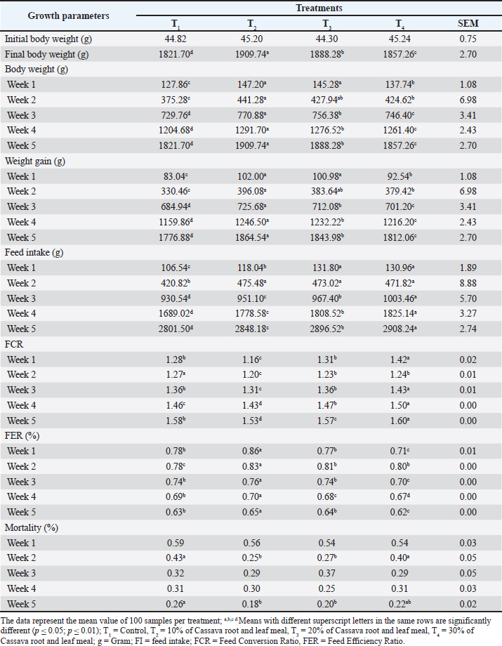 The total phenolics were determined by calorimetry using the Folin-Ciocalteu reagent and, with somewhat modified methods, the methods described by Alam et al. (2024). The measurement of flavonoid contents in the breast and thigh meat extracts was conducted using an updated colorimetric approach, with quercetin being used as the reference compound. Each sample was tested three times to make determinations. Sensory evaluationA team of 10 panelists, who had received some training, was selected from the Department of Agro Product Processing Technology at Jashore University of Science and Technology in Bangladesh. Their task was to do a sensory evaluation of boiled meat samples collected from the breast and thigh muscles blindly. Every panelist consumed one sample for each treatment and evaluated their preferences according to the categories of color, taste, texture, flavor, and overall acceptability. A 9-point hedonic scale was used, where a rating of 1 indicated great dislike and a rating of 9 indicated high liking. Statistical analysisAll collected data were subjected to one-way Analysis of Variance using Statistical Tool for Agricultural Research software (version 2.0.1, 2014), developed by the Biometrics and Breeding Informatics group of the PBGB Division, International Rice Research Institute, Los Baños, Philippines. To investigate the dose-response effect, orthogonal polynomial contrasts were used to test the linear, quadratic, and cubic effects of CRLM. Treatment means were compared using the least significant difference test at a 5% level of significance to determine statistical differences among treatments. Ethical approvalThe Department of Agro Product Processing Technology at Jashore University of Science and Technology, Bangladesh, effectively supported this project. Ethical Review Committee of the Jashore University of Science and Technology for Animal-Based Studies provided permission for the research methods used in this study (ERC/FBST/JUST/2023-152). ResultsProximate composition of cassava LMThe nutrient values of cassava LM were as follows: ash 7.54%, CP 19.75%, crude fat 6.85%, crude fiber 12.56%, NFE 44.35%, and ME 2825.75 kcal/kg. Growth performanceCRLM inclusion significantly affected the growth performance of broilers (Fig. 1). Initial body weights were similar across groups, ranging from 44.30 g (T3) to 45.24 g (T4). From week 1 onward, a notable difference emerged. T2 had the highest body weight in week 1 (147.20 g), followed by T3 (145.28 g), T4 (137.74 g), and T1 (127.86 g). By week 5, T2 maintained the highest final body weight (1909.74 g), while T1 was the lowest (1821.70 g); T3 and T4 recorded 1888.28 and 1857.26 g, respectively.