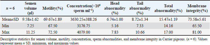Fig. 1. A view of the Carrier pigeons used in the study. Materials and MethodsResearch area and experimental designSix clinically healthy male Carrier pigeons, 1.5 years old and weighing 350–400 g, with no pathological findings upon genital examination, were used in this study. Animals were brought to the Fırat University Animal Hospital between May and October 2024. Animal welfare principles were strictly observed throughout the study. Pigeons were housed in individual cages and fed with high-quality commercial feed. Water was provided ad libitum. The pigeons were maintained under standard environmental conditions, including a controlled temperature of 22°C ± 2°C and a 12:12 hours light/dark cycle. For ethical reasons, only pigeons whose owners consented to participate were included in the study. All owners provided signed informed consent forms before the experiment. We conducted a retrospective power analysis using G*Power (version 3.1) to assess the statistical robustness of our dataset. For two-tailed Pearson correlation tests (α=0.05, n=6), the achieved power was approximately 0.15 for a large effect size (r=0.50) and 0.08 for a medium effect size (r=0.30). For two-tailed paired t-tests (α=0.05, n=6), the achieved power was approximately 0.36 for a large effect size (d=0.80) and 0.17 for a medium effect size (d=0.50). Semen collection and analysisThe abdominal massage technique was used to collect semen from male pigeons (Cheng et al., 2002; Rakha et al., 2025). Six male Carrier pigeons were used in this study. Between May and October, semen was collected once a month from each pigeon brought to the animal hospital. The ejaculates were individually evaluated to eliminate the uncertainty caused by pooling and to accurately determine which bird had better sperm quality. After checking for contamination with blood, feces, or uric acid, the samples were evaluated. To minimize stress and potential negative effects during semen collection, particular attention was paid to factors such as the timing of collection and the personnel involved in the procedure. The individual evaluation was performed for each ejaculate. Semen volume was determined by aspirating it from the cloaca using an automatic pipette (Brand, USA). For motility analysis, a clean microscope slide was first placed on a heating stage (Reichert, Austria) maintained at 37°C. Motility was evaluated subjectively, and to standardize the assessment, a 5 µl semen sample was diluted with 95 µl of Ringer’s solution (9 g NaCl, 0.3 g KCl, 0.33 g CaCl2, and 0.2 g NaHCO3 dissolved in 1 l of distilled water), which served as a semen extender, then covered with a coverslip and examined using a digital microscope with an LCD screen (Celestron, USA) at 10 × 40 magnification (Blesbois, 2007; Wannaratana et al., 2021). Semen concentration was calculated using the hemocytometric method with a hemacytometer (Marienfeld Superior, Germany) (Aksu et al., 2016). The rate of membrane integrity was determined by examining smears prepared from semen samples stained with eosin-nigrosin stain, which was prepared using 1.67 g eosin Y, 10 g nigrosin, and 2.9 g sodium citrate in 100 ml distilled water (Pabuççuoğlu, 1994; Sharma and Agarwal, 2021; Shetty and Kanna, 2023). The proportion of abnormal spermatozoa in semen was also determined using the same smears prepared by the eosin-nigrosin staining method (Hafez, 1987; Bearden and Fuquay, 1992). Statistical analysisAll statistical analyses were performed using the statistical software R version 4.1.2 (The R Foundation for Statistical Computing, Vienna, Austria). The study was designed as an observational experiment with repeated semen collections from six adult male pigeons once per month between May and October (six repeated measures per individual). The statistical analysis aimed not to compare groups but to evaluate the relationships among semen quality traits. Therefore, correlation analyses were conducted. Before analysis, data were checked for normality using the Shapiro–Wilk test. Pearson’s correlation coefficients (r) were calculated for normally distributed variables, while Spearman’s rank correlation was used otherwise. Numerical variables were presented as means, and categorical variables were expressed as percentages (%). The volume and concentration of semen obtained from pigeons were analyzed as mean values. Motility values, as well as abnormal sperm and membrane integrity ratios, were analyzed as percentages (%). Pearson’s correlation analysis was used to evaluate the relationships between spermatological parameters. Correlation coefficients (r) were calculated, and statistical significance was set at p < 0.05, p < 0.01, and p < 0.001 (Petrie and Watson, 2013). Ethical approvalThis study was approved by the Local Ethics Committee of Fırat University Animal Experiments with the session number 2024/07-06 dated 04.04.2024, with the decision that an ethics committee certificate is not required. ResultsThe volume of semen obtained from Carrier pigeons ranged from 7.25 to 11.25 µl, with an average of 9.58 ± 1.62 µl, as presented in Figure 2. Figure 3 shows the total motility values of the semen obtained from carrier pigeons, ranging from 67.50% to 72.50%, with a mean value of 69.67% ± 1.89%. Semen concentration, as demonstrated in Figure 4, ranged from 3176.75 × 106 to 4079.00 × 106 sperm ml−1, and the average concentration was calculated as 3630.25 ± 388.26 × 106 sperm ml−1. The membrane integrity results (Fig. 5) varied between 65.50% and 81.00% with a mean value of 73.58 ± 5.61. Abnormal spermatozoa (Fig. 6) were evaluated in two categories: head and tail abnormalities. Head abnormalities ranged from 5.16% to 7.83%, with an average of 6.74% ± 1.00%, whereas tail abnormalities ranged from 7.33% to 10.66%, with a mean of 8.72% ± 1.34%. The overall abnormal sperm rate varied between 14.16% and 17.00%, and the average abnormality rate was determined to be 15