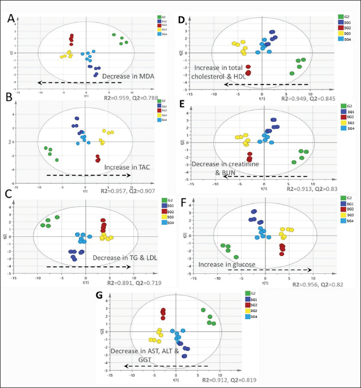 Fig. 1. PLS-derived score plots obtained by correlating GC-MS-derived serum metabolite profiles of the pneumonic sheep group (G2, green dots) and the pneumonic sheep groups treated with: Traditional therapy (SG 1), combined traditional therapy and silymarin 280 mg (SG 2), silymarin 280 mg (SG 3), and silymarin 560 mg (SG 4) to the tested biochemical markers (A) MDA, (B) TAC, (C) TG and LDL-cholesterol, (D) total and HDL-cholesterol, (E) kidney function tests (creatinine and urea), (F) blood glucose concentrations, and (G) liver activities (blood serum AST, ALT, GGT). Table 5. Serum metabolite percentile level based on gas chromatography/MS analysis.