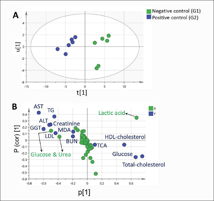 Fig. S1. PLS model correlating GC/MS-metabolite profiles of the serum of healthy control group (G 1) and pneumonic control group (G2) to the tested biochemical parameters as MDA and TAC, lipid profile (TG, cholesterol, HDL-cholesterol, LDL-cholesterol), blood glucose concentrations, liver activities (blood serum AST, ALT, GGT, and kidney function tests (creatinine and urea). (A) PLS score plot. (B) Loading plot showing the covariance p[1] against the correlation p(cor) [1] of the discriminating component variables of the PLS model.