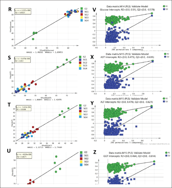Fig. S2. Regression analysis of the PLS predictive model for each y variable modeled in the PLS models shown in Figure 1 and their respective permutation plots. (A and E) MDA, (B and F) TAC, (C and G) TG, (D and H) LDL-cholesterol, (J and N) total cholesterol, (L and O) HDL-cholesterol, (L and P) creatinine, (M and Q) urea, (R and V) blood glucose concentrations, (S and X) blood serum AST, (T and Y) ALT, and (U and Z) GGT.