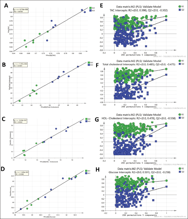 Fig. S4. Regression analysis of the PLS predictive model for each y variable modeled in the PLS model shown in Figure 2 and their respective permutation plots. (A and E) TAC, (B and F) total cholesterol, (C and G) HDL-cholesterol, and (D and H) blood glucose concentrations.