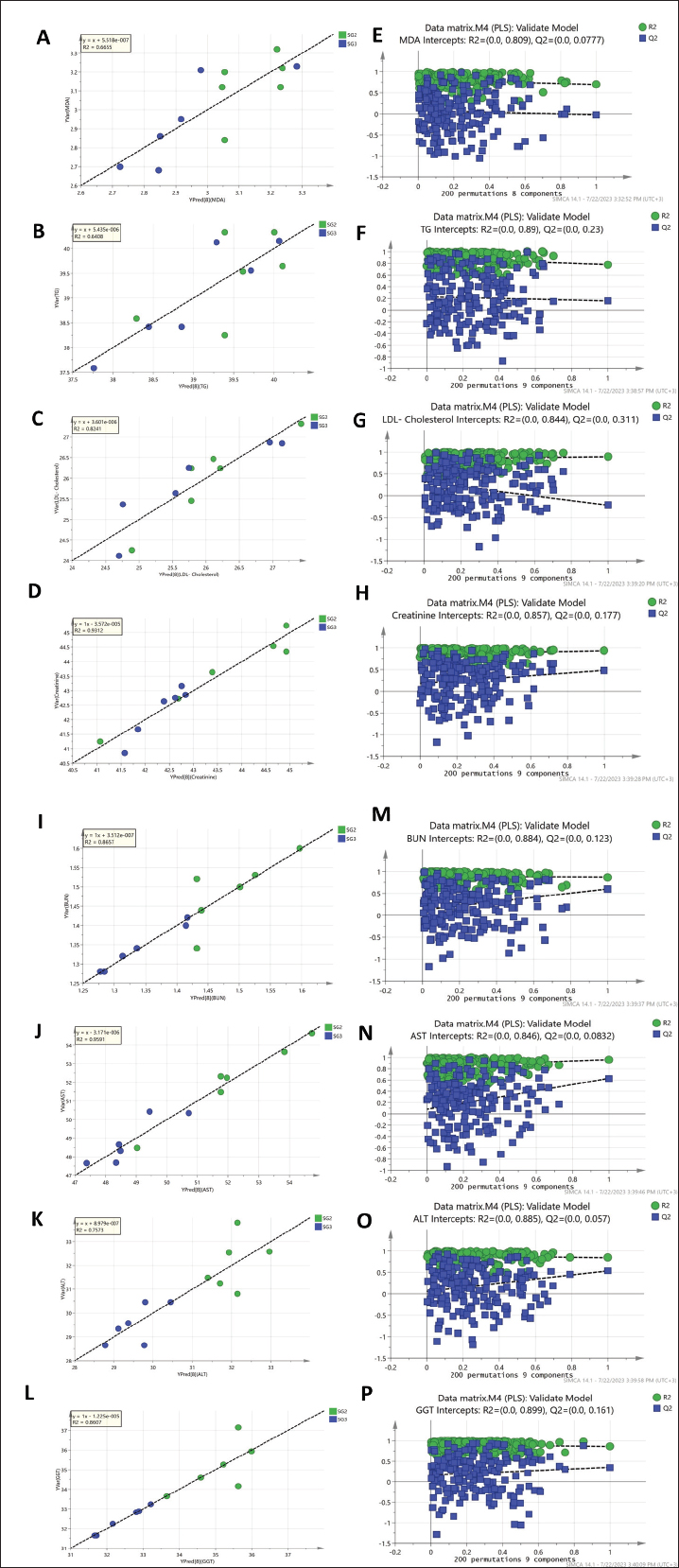 Fig. S5. Regression analysis of the PLS predictive model for each y variable modeled in the PLS model shown in Figure 2 and their respective permutation plots. (A and E) MDA, (B and F) TG, (C and G) LDL cholesterol, (D and H) creatinine, (I and M) urea, (J and N) blood serum AST, (K and O) ALT, and (L and P) GGT, respectively.