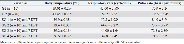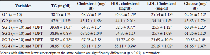 Effect of traditional treatment and/or silymarin on glucose and lipid profilePneumonic sheep had significantly higher triglyceride and LDL-cholesterol and lower cholesterol, HDL-cholesterol, and glucose concentrations than healthy sheep (p < 0.05; Table 3), whereas SG 1, 2, 3, and 4 were not significantly different from healthy sheep at 7 DPT (p > 0.05; Table 3). Table 3. Effect of traditional and/or silymarin treatment on glucose and lipid profiles.