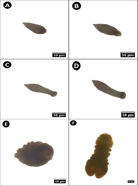 Fig. 2. Microphotograph of parasitic plerocercoids isolated from the digestive tract of S. undosquamis. (A–D) Various stretching forms of tetraphyllidean larvae during movement. (E) Contracted form of L. intestinalis larvae. (F) Expanded form of L. intestinalis. (×40).