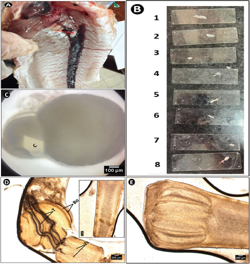 Fig. 3. Microphotograph of Callitetrarhynchus sp. plerocercoid collected from the peritoneum of S. undosquamis. (A) A white parasitic cyst inside the fish’s body (indicated by the red arrow). (B) Variations in the size of the isolated plerocercoids. (C) The shape of the parasite within its cyst under a microscope (×4). (D) Scolex of the parasite (×40), showing four bothria (Bo) and central tentacles (T). The inset (D window) highlights the tentacle sheath extensions (Ts). (E) The posterior end of the larvae (×40) with four identical bulbs.
