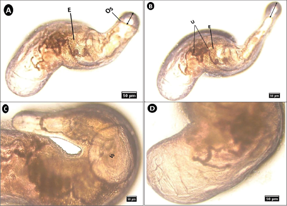 The newly hatched larvae were considerably smaller than the larger third-stage larvae (Fig. 4A), with a size ratio of 1:6. A small, dark pointed tooth was visible at the tip of the blunt anterior end, accompanied by a lateral excretory pore (Fig. 4B). The border along the intestine clearly defined the ventricle (Fig. 4C). Small, green circular rectal glands were scattered around the rectum, which opened to the exterior through a lateral anus (Fig. 4D).