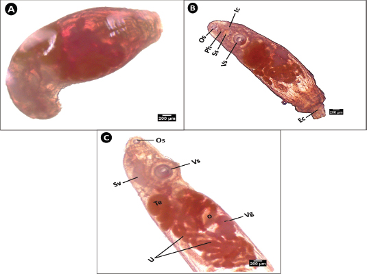 Fig. 7. Microphotograph of Lecithochirium sp. isolated from the digestive tract of S. undosquamis. (×40) (A) Contracted form of the worm. (B) Expanded ventral view. (C) Lateral view showing details of the reproductive organs. Os; oral sucker, Ph; pharynx, Ss; sinus sac, Vs; ventral sucker, Ic; intestinal caeca, Ec; ecosoma, Sv; seminal vesicle, Te: Testis, O; ovary Vg; vitelline glands, U; uterus.