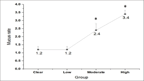 Fig. 9. Mucus rate in relation to the severity of infection.*: significant difference compared with clear fish.