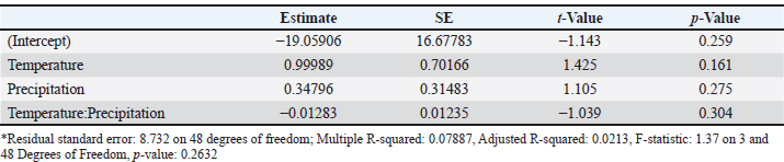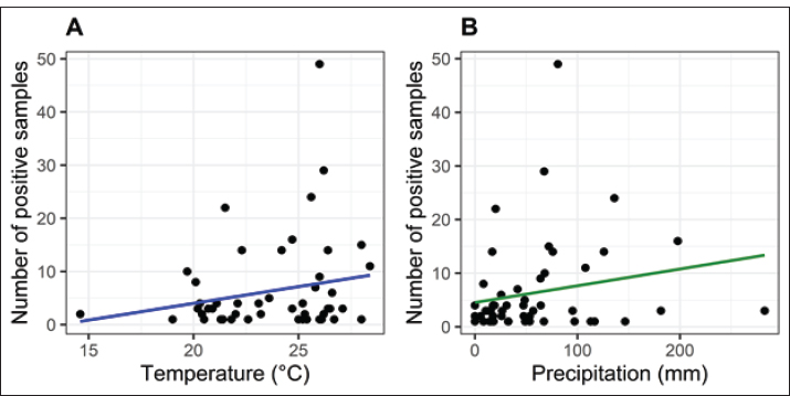 Our multiple regression results for positive samples and climate variables (temperature and precipitation) indicated that the model was not statistically significant (p=0.230), explaining only 1.9% of the total observed variance (adjusted R²=0.0197). The individual effects of environmental variables, temperature (β=0.455; p=0.334) and precipitation (β=0.022; p=0.363), had positive coefficients, although the two environmental variables were not statistically significant. The model adjusted to capture possible combined effects between environmental variables (temperature and precipitation) was also not statistically significant (p=0.263), maintaining low explanatory power (adjusted R²=0.0213; Tables 1 and 2; Fig. 5). The variance inflation factor (VIF) was also calculated to make the analyses more consistent, and the value obtained was less than 2, indicating moderate and acceptable multicollinearity.