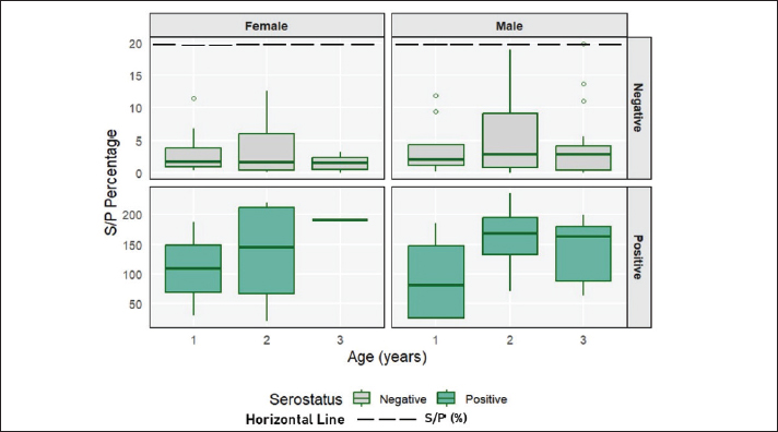 Fig. 2. Boxplot of the percentage distribution of S/P in goats categorized by age group, sex, and serostatus.