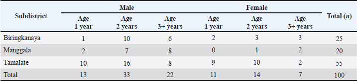 Table 1. Basic characteristics of the goat population sampled across the three selected subdistricts of Makassar, categorized by sex and age group.