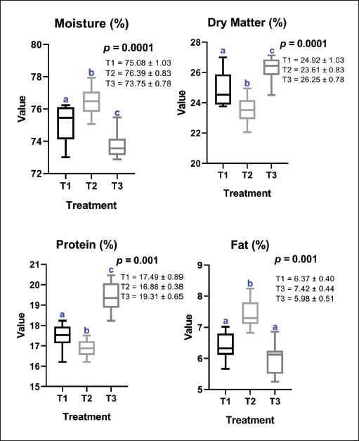 Fig. 1. Nutritional characteristics of guinea pig carcasses based on the bromatological analysis at the end of the study. Moisture (%), dry matter (%), protein (%), and fat (%) are shown for treatments T1=corn fodder (Zea mays), T2=Cuba 22 (Pennisetum spp.), and T3=kurumi (Pennisetum purpureum). ANOVA (p < 0.05). Tukey’s post hoc test is denoted by superscripts a,b, indicating differences between treatments when p < 0.05. DiscussionFeeding and nutrition directly influence the meat and reproductive productivity of guinea pigs, a species that is particularly sensitive to the quality of forage supplied (Bauer et al., 2009). However, studies on guinea pigs under the environmental conditions of Peru’s northern coast remain limited, especially regarding the use of alternative tropical forages. The nutritional composition of forages used in guinea pig feeding can vary considerably, depending on factors such as soil type and fertility, the plant part used, and cutting age (Castro-Bedriñana and Chirinos-Peinado, 2021). Specific nutritional requirements have been established for the Peru breed of guinea pigs to maintain vital functions and promote adequate weight gain (Tapie et al., 2025). However, similar studies for the Kuri breed have not yet been reported, preventing the precise determination of these parameters. Several authors have indicated that housing space affects feeding efficiency (Cáceres O. et al., 2004), which is why cage size was standardized in this study. To minimize sex-related variability and per-farm management policy, only females were used, as previous studies have shown significant zootechnical differences between males and females, especially when the former are castrated (Vega AH Pujada and Astocuri, 2012; de Figueiredo et al., 2020). Nevertheless, it is recognized that protein requirements during gestation and lactation do not significantly affect body weight according to sex (Bauer et al., 2009). Guinea pigs fed with corn fodder showed higher weight gain, consistent with the findings of Reyna-Reyes (2024), who evaluated different forages (corn fodder, forage sorghum, and purple elephant grass). The best productive and economic performance was observed with corn fodder, even though feed conversion did not differ significantly from sorghum. Other authors have reported that corn fodder combined with other forages increases carcass yield (Velis, 2017). Similarly, Espino-Huallpa and W (2024)highlighted a positive effect on feed conversion when broccoli residues were added to corn fodder without significant improvements in weight gain—an opposite effect to that observed with sugarcane tops (Urbina-Alegría and C, 2021). The favorable performance of corn fodder may also be attributed to its high digestible starch content in the cob, which is directly related to growth (Gao et al., 2023; Kussie et al., 2024). Soil characteristics and crop management practices can also influence soil nutritional quality (Buoso et al., 2023; Yeasmin et al., 2024). In this study, corn fodder was fertilized with decomposed guinea pig manure, a technique that, according to Meza-Campos and J (2024), does not produce significant nutritional differences compared with other fertilization methods. Bromatological analysis revealed that this forage provided the highest energy contribution (Kcal) among treatments, although it showed the lowest levels of crude protein, fat, and total fiber. The NV of kurumi grass from the bromatological analysis were consistent with those reported in the specialized literature (Pereira et al., 2021). However, its energy value was lower than that of corn fodder, which may explain its lower impact on growth and weight gain. Similar results have been observed in heifers fed with Kurumi grass, which showed lower weight gains compared with those fed with other legumes (Andrade et al., 2016), although other studies found no significant differences (Crestani et al., 2013). In the present study, a higher (less efficient) feed conversion ratio was also observed, possibly associated with the high palatability of P. purpureum, which can induce greater intake without proportional weight gain (Kampemba et al., 2017). The protein content of Cuba 22 grass was among the highest of the evaluated forages, consistent with the findings of Bacalla (2023). Animals fed with this grass showed productive results similar to those of the Kurumi group. Notably, all animals in this study consumed only the assigned forage. Molina-Portilla and A (2021) reported that the complete replacement of alfalfa with Cuba 22 in guinea pig diets produced comparable weight gains, even in high Andean regions with different climatic conditions. These results indicate that performance may depend more on nutritional content and forage quantity than on climatic factors. In this study, guinea pigs reached market-compatible weights (813 g), according to the standards established by Olivares-García and C (2024). Although factors such as temperature, humidity, and breed were not controlled in this study, they may influence the productive capacity of guinea pigs, even though the species is well adapted to diverse conditions (Sánchez-Macías et al., 2018). Scientific information on Kurumi and Cuba 22 grasses remains scarce and mostly limited to technical bulletins, with few validated studies assessing their impact on guinea pig productivity under field conditions. Other studies have emphasized the capacity of guinea pigs to adapt to dietary variations, partially mediated by efficient glucose absorption in the small intestine, facilitated by specific transporters (Anglas et al., 2012; Kohles, 2014). However, HEDs may reduce total feed intake, thereby improving feed conversion and economic performance (Morales et al., 2011; Quintana et al., 2013). Regarding the bromatological qualities of guinea pig carcasses, the fat content observed in this study was considerably lower than that reported by Huaman et al. (2016), who fo