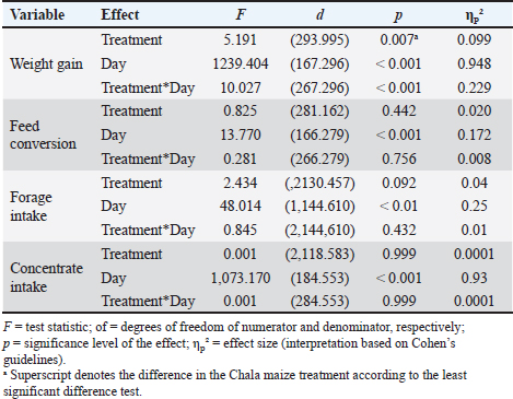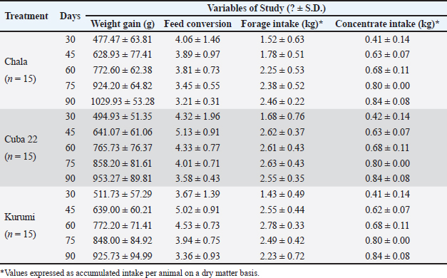 Table 4 shows that the effect of treatment on weight gain was significant (p < 0.05), indicating differences between at least two of the three groups evaluated, with greater weight gain observed in guinea pigs fed with Chala maize. Likewise, a marked variation in weight gain was recorded over time, with the day-to-day effect being highly significant (p < 0.001). The interaction between treatment and day was also significant (p < 0.001), showing that the pattern of weight gain over time differed among treatments. Table 4. Mixed linear model for weight gain, feed conversion, forage intake, and concentrate intake.