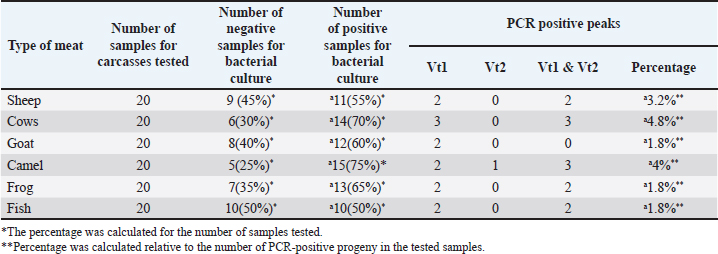 AbstractBackground: The importance of this research is to address the significant concern regarding the presence of (Escherichia coli), which is producing cytotoxic Vero O157:H7 in meat products, and the lack of studies that is occurred in our country on the level of meat contamination with E. coli, which is considered dangerous, and it has implications for the health of consumers of red and white meat. Aim: To detect the presence of E. coli, which produces cytotoxin Vero toxin O157:H7 in red and white meat that is consumed in local markets, and the effects of some preservatives. Methods: This study was conducted in the microbiology and polymerase chain reaction at the Faculty of Veterinary Medicine, Hama University. One hundred and twenty random red and white meat samples that were consumed in local markets in Hama were collected to detect E. coli, which produces cytotoxic Vero toxin, as follows: Twenty samples of each beef, goat, sheep, camel, broiler and fish meat, which are available in the markets and widely consumed. Two hundred and fifty grams of each type of meat sample were collected. The samples were placed in sterile nylon bags to prevent contamination and transported to the laboratory in special thermal containers until the necessary tests were conducted. Results: The analysis of broiler meat samples showed the presence of E. coli that produces cytotoxic Vero toxin O157:H7 in 65% of the samples. The fish meat samples revealed that 10% contained E. coli producing the toxic Vero toxin for O157:H7 cells, with 50% of those strains tested for bacterial culture. Red meat samples indicated that 55% of sheep meat contained E. coli producing the toxic Vero toxin for O157:H7 cells, with 10% of the strains isolated. For beef, 10% of the samples contained E. coli producing the toxic Vero toxin for O157:H7 cells, in 15% of the strains tested. Overall, 60% of the samples had E. coli producing Vero toxin for O157:H7, with 10% confirmed by PCR. Additionally, 75% of the samples tested by bacterial culture contained E. coli producing Vero cytotoxic toxin. Conclusion: The presence of this E. coli bacteria and its detection by PCR test in white and red meat carcasses poses a significant risk to public health, which is evidence of the poor health status of meat markets. Keywords: E. coli, White and red meat, PCR, Public Health. IntroductionMeat is defined as the animal tissue of muscle, fat, and connective tissue that can be used in human food. As this term means the muscular system of the animal, including the organs that are fit for human consumption, like internal organs (heart, liver, and kidneys). It must be intact, with a firm texture, an acceptable odor, a natural reaction closer to acidity (6 ± 2), free from pathogens, and coincident with each state's own customs and traditions, as in white meat (poultry - fish) and red meat (sheep - beef - goats - camels). The contamination of meat with germs (Ahmad and Badpa, 2014) depends on the animal health status, the conditions of its breeding, the hygienic methods, and the conditions of dealing with carcasses. There, the meat is exposed to different contamination sources with germs during the process of slaughtering and preparing carcasses, including air, water, processing tools, surfaces, and workers' hands, and during the removal of the skin and intestines from the carcass (Gill, 1998). In addition, the animal's flesh and skin carry millions of germs, as well as its entrails, which are a major source of meat contamination. Also, the contact of the product with unclean surfaces increases its basic load of germs (Marriott and Gravani, 2006). Some pathogens, such as Escherichia coli and Salmonella, are transmitted through eating meat, starting from slaughtering the animal, removing feathers or skin, evisceration, contaminated nearby carcasses, or slaughtering equipment (Yulistiani et al., 2019). The number of infections transmitted through eating meat each year has been estimated at 600 million cases, 420,000 of them die, including 125,000 children under the age of five, according to World Health Organization estimates (World Health Organization, 2015). There is a lot of research on foods that are contaminated with pathogenic germs, and the most famous food-contaminating germs are E. coli, which produces Shiga toxin, a toxic substance classified as a biological agent (Roy, 2016). It is the most important germ that may be found in meat, E. coli, as more than 90% of cases of these diseases can be caused by germs, but the most prominent of them is pathogenic E. coli (Wagner, 2008). Given the lack of studies in our country on the level of meat contamination with E. coli germs that produce the toxic toxin of dangerous Vero cells, which is related to the health of white meat consumers, this study aimed to reveal the presence of E. coli germs that produce the toxic toxin of Vero cells in white meat consumed in local markets. The objectives of the research: 1- Detecting E. coli spores that produce toxic Vero toxin and determining the level of contamination in white meat (broiler meat, fish meat) and red meat (beef meat, sheep and goat meat, camel meat). 2- Detection of the presence of SLT1-SLT2 (VT1-VT2) genes of Vero cytotoxic E. coli bacteria using polymerase chain reaction (PCR) in white and red meat. Materials and MethodsIncubator, discriminating E. coli cultures, sodium lactate, 4% concentration, and 2% concentration, red meat that includes sheep, beef, goat, and camel, and white meat including broiler meat and fish. Samples120 random samples of red and white meat consumed in Hamma markets, including meat, were collected throughout the year, to detect E. coli that produces cytotoxic Vero toxin as follows: White meat, 20 samples of broiler meat, 20 samples of fish meat. Red meat, 20 samples of sheep meat, 20 samples of beef meat, 20 samples of goat meat, and 20 samples of camel meat, at a rate of 250 g of each type of meat for each sample of meat. The