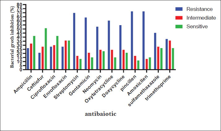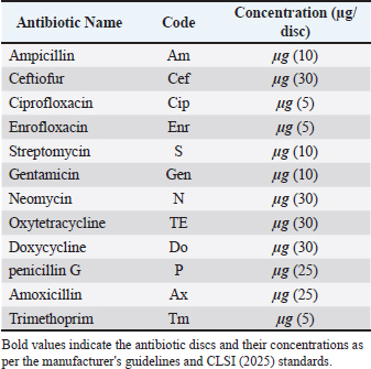 The study revealed the antibiotic resistance patterns among the tested isolates. Resistance rates were highest for penicillin G (84.91%) and amoxicillin (79.25%). Conversely, the most effective antibiotics showed susceptibility rates of cefquinome (71.70%) and ciprofloxacin (66.04%) (Table 5 and Fig. 3). DiscussionOur results demonstrate a remarkably high prevalence of virulence genes among E. coli isolates, occurring both individually and in various combinations of hybrids. These findings substantially exceed the rates reported by Ibrahim (2012) in Syrian cattle farms, where only 6% of isolates carried sta genes, 14% possessed Stx1/Stx2 genes, and 1.33% harbored the eae A gene. More recent data from Cabrera-González et al. (2024) revealed an even more complex virulence profile, 83.15% prevalence of sta genes, 1.05% for stx2, and 21.05% for eae. Notably, we observed significant frequencies of hybrid pathotype combinations EAEC/ETEC (44.21%), STEC/EAEC (3.15%), EPEC/ETEC (2.10%), STEC/EAEC/ETEC (21.05%), EPEC/EAEC/ETEC (6.31%), and EPEC/STEC/EAEC/ETEC (7.36%). Ok et al. (2009) investigated diarrheagenic E. coli in calves and reported sta gene 18.9%, Stx1 gene 13.5%, Stx2 gene 5.4%, and eae gene 8.1%. Nguyen et al. (2011) subsequently identified stx1 alone, 13.3% stx2 alone, 21.2%, and co-occurrence of stx1/stx2, 16.8%. They found substantially lower rates for the sta gene 0.6%, the eae gene 9.8%, and the eae/stx combination 6.7%. More recent data from Cengiz and Adigüzel (2020) revealed stx1 3.03%, stx2 9.09%, sta 21.21%, and eae 15.15%. Their pathotype distribution showed that ETEC was predominant (51.5%), EPEC (15.2%), EHEC (6.1%), and STEC/EHEC hybrid (12.1%). The widespread prevalence of pathogenic E. coli strains observed in this study may be attributed to the absence of E. coli vaccination in the geographical area where the research was conducted, in addition to the presence of some of these virulence genes in phages and plasmids, which facilitate horizontal gene transfer and the emergence of hybrid strains. The observed variations between our findings and those of previous studies may be attributed to differences in geographical regions, the epidemiology of pathogenic E. coli strains, and breeding types and feeding practices. The emergence of AMR stems from genetic modifications through multiple mechanisms, including spontaneous mutations in chromosomal DNA, horizontal gene transfer of resistance determinants via conjugation (plasmid-mediated), transduction (phage-mediated), and transposons (mobile genetic elements) (Normark and Normark, 2002). The findings revealed that E. coli bacteria causing calf diarrhea exhibit widespread resistance to antibiotics. In comparison with previous research, numerous studies have also indicated broad resistance in E. coli isolates from diarrheic calves. Cengiz and Adigüzel (2020) found that the highest resistance rates were to oxytetracycline (78.9%), trimethoprim-sulfamethoxazole (60.9%), and neomycin (58.6%). In contrast, the highest susceptibility rates were to ceftiofur (92.5%), cefoperazone (90.2%), and cefuroxime (90.2%). Paul et al. (2010) discovered that E. coli isolates from diarrheic calves were highly sensitive to enrofloxacin and ciprofloxacin, showed moderate sensitivity to cephalexin and amoxicillin, but were resistant to nalidixic acid and erythromycin. Bok et al. (2015) isolated E. coli from diarrheic calves. These isolates showed the highest resistance rate to neomycin (51%) and the lowest resistance rate to norfloxacin (0.7%). The isolates from cattle showed the highest resistance rate to neomycin (24.6%) and the lowest resistance rate to cefapirin (0.8%). Li et al. (2018) observed that E. coli strains exhibited varying degrees of resistance to 19 commonly used antibiotics, particularly tetracycline, cephradine, doxycycline, carbenicillin, ampicillin, ciprofloxacin, and norfloxacin. Resistance rates for these drugs exceeded 40%, with tetracycline resistance being the most common at 53.7%. No strains showed resistance to neomycin or polymyxin B. Antibiotic resistance in E. coli could also arise from the irresponsible use of antibiotics, the use of multiple antibiotics without testing their efficacy, and the non-completion of treatment. These actions tend to cause bacteria to develop resistance to the applied antibiotics. The discrepancy between the results of this study and previous studies may be attributed to differences in treatment methods and the commonly used medications for managing animal diseases. ConclusionPathogenic E. coli strains are among the most significant causes of diarrhea in calves. These pathogens also represent a zoonotic concern, as they can transmit and infect humans. Extensive resistance to multiple antibiotics poses a major public health threat because multidrug-resistant strains in animals pose a potential hazard to human health. Consequently, E. coli infection treatment must be guided by antibiotic sensitivity testing results. In addition, we recommend limiting the indiscriminate use of antibiotics and conducting more research on the dissemination of pathogenic Escherichia coli strains among animal and human populations. AcknowledgmentsNone. Conflict of interestThe authors declare no conflict of interest. FundingThe main funder of this research is the University of Hama, which provided the laboratories in which the research was conducted. Authors’ contributionsASEEM ALBAKER is the primary researcher, implementer, and writer of the research, as this research is part of the doctoral thesis that is currently being prepared. Dr. MAHER SALEH supervises the research as a scientific supervisor and assistant in directing and writing the thesis, and Dr. ASHRAF ALSALEH is the assistant practical supervisor during the implementation of the research. Data availabilityAll data are provided in the revised manuscript. ReferencesAltaweel, H. and Aldaoud, F. 2023. Investigation of E. coli K99 and rotaviruses causing