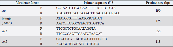 Detection of virulence genesDeoxyribonucleic acid (DNA) extractionDNA templates were prepared by transferring one pure bacterial colony into 50 μl of sterile distilled water. The tubes were then boiled in a water bath for 10 minutes, followed by centrifugation at 12,000 × g for 15 minutes. The supernatant was carefully collected and used as the DNA template for multiplex polymerase chain reaction (PCR) (Cengiz and Mehmet, 2020). Multiplex PCR assayThe virulence factor genes (sta, eae, stx1, and stx2) were detected using specific primers (Table 2). The PCR reaction mixture (25 μl final volume) consisted of the following: (3 μl DNA template, 1 μl each of forward and reverse primers (100 pmol/ul), 2.5 μl PCR buffer, 1.5 μl MgCl2 (25 mM), 0.5 μl dNTP mix, 0.5 μl Taq polymerase, and nuclease-free water up to 25 μl). The thermal cycling protocol was performed as follows (Cengiz and Mehmet, 2020): (Initial denaturation: 94°C for 3 minutes, 30 amplification cycles: (Denaturation: 94°C for 30 seconds, Annealing: 50°C for 45 seconds, and Extension: 72°C for 1.5 minutes) and Final extension: 72°C for 10 minutes. Table 2. Oligonucleotide primers used for the detection of E. coli virulence genes (Cengiz and Mehmet, 2020).