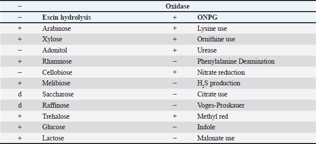 Statistical analysisData processing and graphical representation were performed using Microsoft Excel 2019 and GraphPad Prism (v8.2.1). Ethical approvalEthical approval was provided by the College of Veterinary Medicine, Hama University, Hama, Syria (No. 479, Date 20/2/2024). Rectal fecal samples were obtained from animals without anesthesia or tranquilizers after obtaining the permission of the farmers. ResultsEscherichia coli was found in 53 of 60 diarrheic calves on MacConkey and EMB media, giving an occurrence prevalence of 88.3%; in contrast, 7 remaining cases were negative for E. coli. The biochemical test results are summarized in Table 4 (Fig. 1).