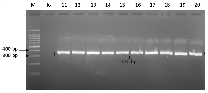 Fig. 1. Gel electrophoresis results for cdtA gene detection (370 bp). Note: Lanes: M, 100-bp marker; K-, control negative; 11-20, representative of Campylobacter jejuni isolates The presence of the cdtB gene, which is the active subunit responsible for host cell DNA damage, was confirmed by the detection of a 620-bp PCR product (Fig. 2).