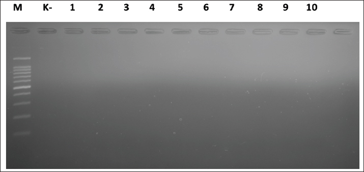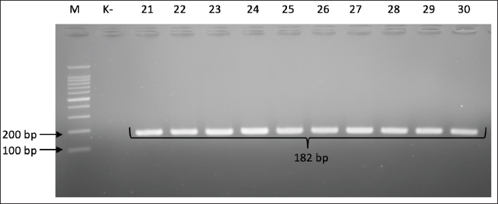 Fig. 3. Gel electrophoresis results for cdtC gene detection (182 bp). Note: Lanes: M, 100-bp marker; K-, control negative; 21-30, representative of Campylobacter jejuni isolates. The test results showed that of the 40 C. jejuni isolates examined, all (100%) gave negative results for the presence of the virB gene. The absence of this virB gene was proven through PCR, where the absence of a DNA amplification product at a specific size (494 bp) indicated the absence of the target gene from the bacterial genome. Figure 4 visually confirms the absence of the expected DNA band for all tested isolates, indicating that this pathogenic pathway may not be present in the circulating strains in the sample source.