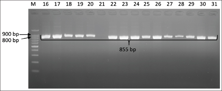 Fig. 5. Gel electrophoresis results for flaA gene (855 bp) detection Note: Lanes: M, 100-bp marker; K-, control negative; 16-31, representative of Campylobacter jejuni isolates DiscussionForty isolates of C. jejuni were identified from 200 broiler small intestine samples examined. This indicates a 20% prevalence rate of C. jejuni in broilers in the study area. This finding aligns with a previous study in Indonesia, which reported a C. jejuni prevalence of approximately 23% in broilers based on the hipO gene PCR test, underscoring the importance of surveillance in the Indonesian poultry sector (Yanestria et al., 2023). This prevalence is also within the range found in other regions such as Egypt, where the C. jejuni isolation rate in poultry samples was reported to be approximately 37% (Barakat et al., 2020). This percentage reflects a significant prevalence rate of pathogenic bacteria that potentially pose a zoonotic risk to humans, especially considering that poultry is the primary reservoir of C. jejuni, the leading cause of campylobacteriosis in humans (Amjad, 2023). Several other studies from Algeria and Kenya have reported a high prevalence of C. jejuni in broiler chickens, emphasizing variations in prevalence rates due to differences in detection methods, sample sizes, and geographic factors, with annual prevalence rates reaching over 70% at some sampling points (Baali et al., 2020; Wanja et al., 2024). Campylobacter sp. is a very important zoonotic bacterium that is a major source of foodborne illness worldwide, and its contamination is often found in undercooked poultry products (Shaltout and Shaltout, 2024). In several studies, PCR targeting the hipO gene has been widely used to identify C. jejuni in both chicken samples and its derivatives (Syarifah et al., 2020; Alarjani et al., 2021). The use of selective media and microaerophilic atmospheric conditions during the isolation process has been shown to be effective for the growth of this bacterium, thus strengthening the validity of the findings of similar studies (Prayudi et al., 2023). Confirmation of the specific identity of C. jejuni through PCR targeting the hipO gene is crucial because this gene encodes the enzyme hippurate oxidase. Amplification of a fragment size specific to hipO (approximately 323 bp or varying depending on the primer used) has been used as a standard in many molecular studies (Alarjani et al., 2021; Liu et al., 2022). The use of specific primers for this gene allows for the rapid and accurate detection of isolates obtained from poultry laboratory cultures (Shams et al., 2017). All tested C. jejuni isolates (100%) were positive for the cdtA, cdtB, and cdtC genes. These genes are part of the CDT operon, which produces a toxin that can cause DNA damage and apoptosis in host cells. CDT is an important virulence factor that causes cell distension, cell cycle block, and DNA damage that can ultimately lead to cell death (Pons et al., 2019). The simultaneous presence of all three cdt genes indicates the high pathogenic potential of the C. jejuni isolates found in this study, given the key roles of the cdtA, cdtB, and cdtC genes in the synthesis and function of the CDT toxin. CDT toxin has been shown to contribute to various clinical manifestations of Campylobacter sp. infection, including diarrhea, Guillain-Barré syndrome, and reactive arthritis, which are serious systemic complications associated with Campylobacter sp. infection (Wanja et al., 2024). Recent studies have also shown that CDT toxin can trigger a chronic inflammatory response, exacerbate tissue damage, and induce a cellular senescence phenotype that worsens the clinical condition (Faïs et al., 2016; Shenker et al., 2024). This consistent cdt virulence profile highlights the potential public health hazard of Campylobacter sp. strains circulating in Indonesian poultry, especially since poultry are the main reservoir and source of Campylobacter transmission to humans (Wysok et al., 2020). These findings are consistent with those of other studies in Asia and globally, where approximately 90%–100% of chicken isolates were reported to carry the cdtA, cdtB, and cdtC genes. For example, studies from China, Japan, and Korea reported a near-universal prevalence of the cdt gene in chicken isolates (Kim et al., 2019a; Li et al., 2020b; Saito et al., 2021). This confirms that these toxin genes are not only genetically conservative but also can serve as key markers of C. jejuni virulence. The presence of the cdt gene can be a key indicator in epidemiological studies and the development of infection mitigation strategies (Zhang et al., 2022; Nguyen et al., 2023). In contrast, virB was not detected in any of the C. jejuni isolates. The virB gene is a key component of the T4SS, which transfers DNA and protein molecules from bacteria to host cells or other bacteria for conjugation and modulation of the microbial environment (Drehkopf et al., 2023). This system also plays a crucial role in pathogenicity mechanisms in various Gram-negative pathogenic bacteria, including some Campylobacter strains, by facilitating the transfer of genetic elements or virulence effectors that can influence the host immune response (Matys et al., 2020). However, in this study, all C. jejuni isolates examined did not show the presence of the virB gene. The absence or abnormality of the virB gene in C. jejuni isolates may indicate several factors. First, other pathogenicity mechanisms, such as the type III secretion system (T3SS) or type VI secretion system (T6SS), adhesion factors, motility factors, and toxin factors, may be more dominant in these isolates (Kim et al., 2019b). This is also supported by research findings showing that not all virulence in C. jejuni depends on the presence of the T4SS or virB but also involves a combination of various other genes, such as flaA, cadF, cdtA, cdtB, and cdtC (Lima et al., 2022). Second, there is the potential for virB gene sequence variatio