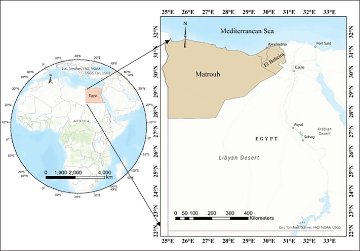 Fig. 1. Map of the studied area, El Beheira, Alexandria, and Matrouh Governorates in the northern and costal part of Egypt. Sample collection and processingA total of 196 blood samples were randomly collected from 18 small-scale sheep farms across three governorates. Six flocks were sampled from each governorate, with 10–11 samples collected per flock. These samples were collected from clinically healthy sheep, many of which had a history of abortion, with their owners providing informed oral consent. During sampling, data were gathered on various factors, including the sheep’s age, breed, pregnancy status, flock size, and household sanitation practices, such as post-parturition isolation of ewes with their lambs and disinfection of the lambing area. Additionally, 242 blood samples were collected from women with a history of abortion, aged 15–40 years, admitted to the labor wards at El Shatby Hospital for Obstetricians and Gynecologists in Alexandria, Egypt. Human samples were obtained with their consent. Relevant data, such as age, residence (by governorate), contact with sheep, abortion history, and miscarriage trimester, were obtained to assess the risk factors influencing C. abortus infection in humans. All blood samples were collected in vacutainer tubes with clotting factor and then sent to the laboratory in an icebox. After centrifugation at 1,000-× g for 15 minutes, sera from each tube were transferred into 1.5 ml Eppendorf tubes marked with the identifier label of each sample and preserved at −20oC until further serological analysis. The sample size was determined to ensure a 95% probability of detecting parasite exposure, assuming a minimum individual prevalence rate of 13.7% (Shaapan et al., 2010). Serological examinationAll sheep serum samples were tested for the presence of specific anti-C. abortus antibodies using a commercially available indirect ELISA kit (ID Screen® Chlamydophila abortus Indirect Multi-species, Product code: CHLMS-MS-2P, Innovative Diagnostic Vet Laboratories, France). The ELISA plates were coated with MOMP specific to C. abortus, thereby reducing the frequency of non-specific reactions. The kit provided positive and negative control animal sera for test validation. The optical densities of the samples were detected using an ELISA reader at 450 nm. The sample-to-positive ratio (S/P) % was calculated for result interpretation, and serum samples with S/P% ≤ 50%, ≥60%, and 50%–60% were considered negative, positive, and doubtful, respectively. According to the manufacturer’s instructions, the assay was considered valid if the average optical density (OD) of the positive controls was > 0.35 and the ratio of the mean OD value of the positive controls to the mean OD value of the negative controls was > 3. The estimated sensitivity and specificity of this kit were 100% and 99.7%, respectively (Pourquier et al., 2007). Three conjugates were used in this study to detect anti-C. abortus-specific antibodies in the serum samples of all women. These conjugates were the anti-multi-species IgG-Horseradish peroxidase (HRP) conjugate of the ELISA kit mentioned above, peroxidase-conjugated anti-human IgG secondary antibody (I2136-1ML, Sigma) at a dilution of 1:1000, and HRP conjugated anti-human IgM secondary antibody (K0211485, Koma Biotech) at a dilution of 1:1000. The three conjugates were used in separate ELISA runs to confirm the serological testing results of serum specimens from aborted women. Checkerboard titration was employed to estimate the antigen, serum, and conjugate concentrations. Negative mean OD values + 2SD were used to deconjugate the cut-off value (Hassanain et al., 2016). Assessment of risk factorsThe correlation between risk variables and the seroprevalence of C. abortus in sheep and women was determined using logistic regression analysis. Age group, breed, habitat, pregnancy status, history of abortion, breeding system, and hygienic measures were the six risk factors examined in sheep. In humans, six risk factors were examined, including age, habitat, place of residency, contact with sheep, previous miscarriages, and trimester of miscarriage were examined. (Abd El Wahab et al., 2018). Statistical analysisThe resulting data were statistically analyzed using SPSS version 22. Chi-square and Fisher’s exact tests were used to investigate the association between each factor and the prevalence rate of C. abortus. Fisher’s exact test was also used when >20% of cells had an expected value ˂5. A logistic regression model was used to assess the potential relationship between variables (Abouelsoued et al., 2020). Differences in the seroprevalence rates were considered statistically significant if the p-value ˂ 0.05. The odds ratios and 95% confidence intervals were calculated for each factor. Ethical approvalThe research protocol was approved by the Ethics Committee of the Faculty of Medicine, Alexandria University (Approval No. 0305821 at June 14, 2024). All participants provided informed consent. For individuals aged 15–20 years, consent was also secured from their parents, who were fully informed about the study’s objectives. Furthermore, the ethics committee of South Valley University in Qena, Egypt, authorized the protocol (No. 76/02. 10.2022). The study was conducted under the Animals in Research: reporting in vivo experiments (ARRIVE) criteria (Du Sert et al., 2020). ResultsSeroprevalence of C. abortus among sheep and humansThis study observed an overall seroprevalence rate of C. abortus of 12.8% (56/438) among the examined cases. The seroprevalence was 12.2% (24/196) in sheep serum samples and slightly higher at 13.2% (32/242) in serum samples from women who had experienced abortions (Table 1). The C. abortus serological assay, utilizing the anti-multi-species IgG-HRP conjugate and peroxidase-conjugated anti-human IgG secondary antibody (I2136-1ML, Sigma), did not detect antibodies in the examined human serum samples. Theref