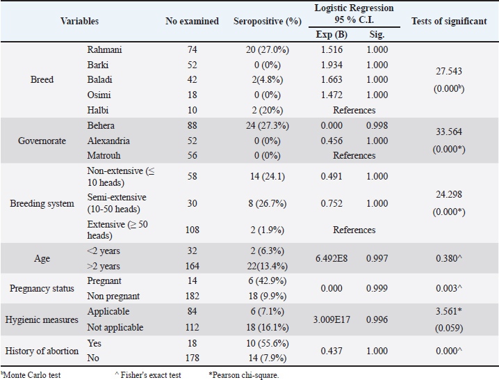 Seroprevalence of anti-C. abortus antibodies in sheep and assessment of risk factorsTable 2 shows the seroprevalence among different categories of sheep used in the current study. The seropositivity rate varied significantly (p=0.000) among sheep breeds, with the highest rate detected in the Rahmani breed (27%; 20/74), followed by Halbi (20%; 2/10) and Baladi (4.8%; 2/42). No antibodies were detected in the sera of the Barki and Osimi breeds. The logistic regression revealed that all breeds were considered as risk factors compared to the Halbi breed, but without statistical significance (p= 1.000). Additionally, antibodies were detected only in sheep sera collected from Behera Governorate (27.3%; 24/88), while they were not detected in samples collected from the other two governorates, Alexandria and Matrouh. Notably, Alexandria can be regarded as a protective factor (Exp=0.456) compared with Matrouh. The breeding system (flock size) additionally significantly (X2=24.298; p=0.000) affected C. abortus seropositivity, with the highest prevalence (26.7%; 8/30) detected in the semi-extensive system and the lowest (1.9%; 2/108) in the extensive system. Table 2. Prevalence of Chlamydia abortus infection in the examined sheep in relation to the associated risk factors.
