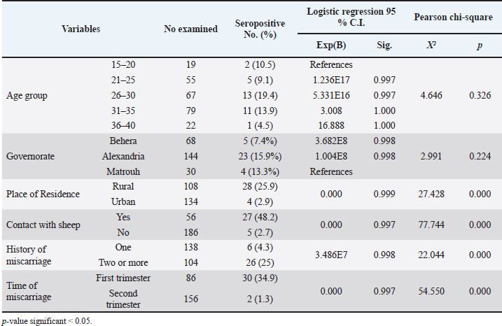 Regarding the sociodemographic characteristics presented in Table 2, the seroprevalence of older animals (>2 years old) was 13.4% (22/164), which was higher than the 6.3% (2/32) observed in younger animals (< 2 years old). However, this difference was not statistically significant (Exp=6.492E8; sig=0.997). Fisher’s exact test revealed no statistical association between age and C. abortus infection (p=0.380). However, pregnancy status was a significant factor associated with C. abortus infection (p=0.003), as pregnant ewes exhibited a higher seroprevalence of 42.9% (6/14) compared to 9.9% (18/182) in non-pregnant ewes. Despite this difference, no statistical significance was found between these groups (Exp=0.000; sig=0.999). Seroprevalence of anti-C. abortus antibodies in women with abortion and risk factor assessmentTable 3 illustrates the associations between C. abortus infection and various sociodemographic characteristics and risk factors among the women who underwent abortion. The highest seroprevalence rate was observed in participants aged 26–30 years (19.4%), followed by those aged 31–35 years (13.9%), 15–20 years (10.5%), and 21–25 years (9.1%). The lowest prevalence (4.5%) was found in the age group of 36–40 years. Although logistic regression indicated that all age groups were associated with an increased risk of infection compared with the reference group (15–20 years), these associations were not statistically significant. The Pearson chi-square test also confirmed that age was not significantly related to C. abortus infection incidence (X²=4.646; p=0.326). Similarly, the prevalence rates across the governorates were highest in Alexandria (15.9%), followed by Matrouh (13.3%) and Behera (7.4%). Table 3. Risk factors associated with C. abortus seropositivity in aborted women.