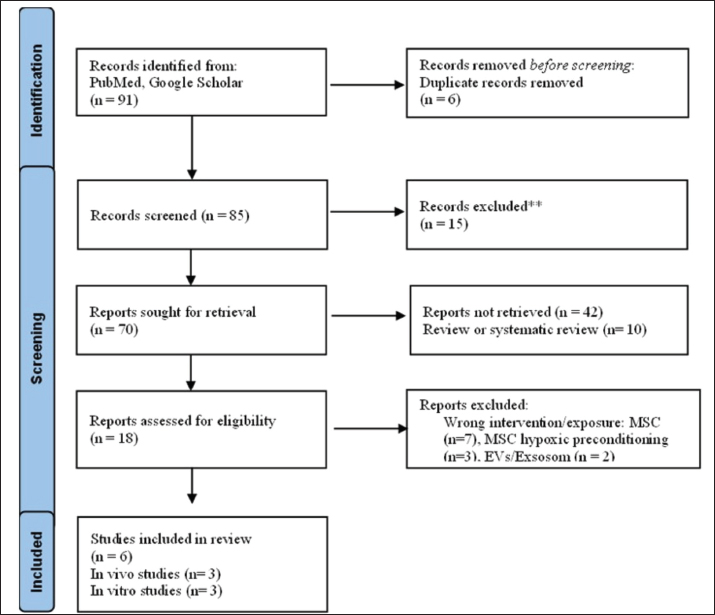 Fig. 1. Study selection flowchart. The PRISMA flow chart depicts the amount of data identified, included, and eliminated during various rounds of the systematic review. Data extractionWe collected the following information for each selected paper: author, journal, year of publication, country, ischemia model, animal type (including species, strain, sex, age, and weight), method of hypoxic preconditioning of the MSC, dosage, and outcomes. Findings were categorized based on lesion size, neurological function/behaviour, and indicators of neurogenesis, neuroprotection, and angiogenesis in the spinal cord. Quality assessmentWe assessed the methodological quality of the included studies using a checklist that evaluated criteria, such as growth factors, MSC hypoxia collection techniques, outcomes, controls, interventions, hypoxic conditions, duration, stem cell type, disease models, population, and study design. Each study was assigned a quality score on a 100-point scale. Two authors independently evaluated the methodological quality of the included studies. If there was a discrepancy in the quality scores between the reviewers, particularly when one rated a study below 50, discussions were held with a third reviewer (WA, JHS, or RN) to reach a consensus. Discrepancies were rare, occurring in less than 1% of the cases, as the two reviewers generally had similar assessments of the data. A total of 91 non-duplicate publications were identified. After screening the titles and abstracts, 15 were excluded for irrelevance or not meeting the criteria. Of the 72 full-text articles reviewed, 52 were excluded due to insufficient data on hypMSC-CM or study design limitations. Finally, six studies met the inclusion criteria and were selected for this systematic review (Fig. 1). The therapeutic effect of hypMSC-CM and its secretome in the treatment of ischemic stroke was the primary focus of these studies. Most of the included studies used the middle cerebral artery occlusion (MCAO) model in rodents, which is widely accepted as a representative preclinical model for ischemic stroke (Table 1). In vivo studies have consistently demonstrated that hypMSC-CM administration reduces infarct volume, improves neurological recovery, and promotes angiogenesis, neurogenesis, and neuroprotection through various signaling pathways (Table 2). Additionally, in vitro investigations using neuronal cultures and microglial cells under OGD conditions confirmed the anti-inflammatory and neuroprotective effects of hypMSC-CM. Table 1. Characterization of articles included in the study.