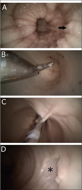 Fig. 1. Colonoscopy-guided colon biopsy technique. Figure A shows the endoscopic appearance of the rectum revealing longitudinal rectal folds (arrow). Figure B reveals the appearance of the colon before tissue grasping with the colon lumen being inflated and smooth and glistening mucosa. Figure C shows the biopsy punch while the tissue is grasped. Figure D illustrates the colon mucosa site after tissue collection (asterisk). Microscopic examination of the histology sections revealed that all grasped tissues, including even small-sized biopsies, yielded identifiable mucosal and submucosal architectures. Complete smearing or smashing of the colon tissue was not observed in any sample. The sections were mainly composed of the mucosal layer, with numerous crypts of Lieberkuhn glands and goblet cells within the lamina propria and loose connective tissue in the submucosa (Fig. 2).