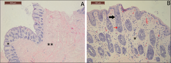 Fig. 2. Histological morphology of colon tissue stained with H&E. Figure A shows the general appearance of the collected tissue from the colon illustrating the mucosal layer (asterisk) and the submucosal layer (double asterisk). The colon crypt is indicated by a black arrow in Figure B, while the red arrow indicates goblet cells. The lamina propria in Figure B is labeled with an asterisk. DiscussionPrioritizing the application of less invasive clinical methods over those that require major surgery has a huge advantage for the welfare of camels. Endoscopy-guided colon biopsy is a minimally invasive procedure that has the potential to expand the understanding of some unexplored diseases in camel medicine. The technique is not time-consuming and is likely to be safe when performed by experienced clinicians. The biopsy technique of the colon tissue is feasible, repeatable, and provides a satisfactory histological assessment. Although this study was conducted on cadaver samples, the impact of our findings would support the possible translation of this technique into its clinical application. The initial validation of cadaver samples aligns with the application of the 3Rs in animal research, which involves replacement, reduction, and refinement (Cheluvappa et al., 2017). This study represented an effective replacement of live animals with cadaveric colon samples, thus avoiding unnecessary pain, suffering, stress, and mucosal hemorrhage. Traditionally, colon tissue samples have been collected from diseased camels during postmortem examination (Alharbi et al., 2012). However, this method is associated with tissue autolysis, especially when sampling is not performed immediately after slaughter (Cocariu et al., 2016). Furthermore, if samples are not handled properly during transportation, they are likely to be subjected to tissue damage (Brooks, 2016). In contrast, sampling via laparotomy has been successfully achieved in horses and enabled full-thickness biopsy of the intestine for the diagnosis of inflammatory bowel disease (Boshuizen et al., 2018). However, this method requires the use of general anesthesia, is invasive, has a risk of wound contamination post-surgery, and requires intensive postoperative care. In contrast, colon biopsy with the aid of endoscopy can be performed when the animal is slightly sedated and in sternal recumbency (or) when the animal is standing.Moreover, the aforementioned complications are likely to be avoided when a colonoscopy-guided colon biopsy is performed. The possible futuristic clinical application of this technique would aid in the diagnosis of many diseases affecting the intestine of camel, especially those with a chronic nature, such as paratuberculosis or neoplasia. In a previous study by Hereba et al. (2015), the pathological examination of the camels affected with paratuberculosis revealed that the mucosa had obvious corrugation, which is often severe enough to be manually palpated during rectal examination. Similarly, in horses, gastrointestinal biopsy is useful for identifying the exact cause of chronic undifferentiated diarrhea by detecting the type of leukocytic infiltration in histopathological sections (Hostetter and Uzal, 2022). The application of colon biopsy, with the aid of endoscopy, would also allow better detection of diseases affecting camel’s intestine, such as paratuberculosis, and coccidiosis. Additionally, it would pave the way for the identification of unknown disorders. Our results indicated that the histopathological architecture was preserved in all samples, and no histological artifacts were found. In normal camels, the normal mucosal layer of the colon is composed of columnar epithelium with prominent Lieberkuhn crypts, which appear as inward invagination of the intestinal mucosa down into the lamina propria, as observed in our samples (Mohamed et al., 2018). Goblet cells, specialized glands responsible for mucus secretion, were abundantly found in the histological sections (Al-Samawy et al., 2019). It is expected that when this method is incorporated into practice in the future, it would facilitate the identification of histopathological lesions associated with the disease process. The possible limitations associated with our study include that the application of biopsy on cadaver samples does not allow for the assessment of the effect of peristalsis on grasping efficacy, intestinal inflation challenges, mucosal hemorrhage extent, and patient tolerance. These factors should be considered when the procedure is repeated on live animals. However, a blind colon biopsy has been reported with great success in horses. The clinician manually holds the rectal mucosa to direct it into the arms of the biopsy punch and eventually collects the required tissue (Mair et al., 2011). Therefore, the clinical application of this technique in camels can be practically replicated and refined. In conclusion, the validation and optimization of colonoscopy-guided colon biopsy on cadaver samples have the potential to replicate the technique in clinical cases. Endoscopy enables a clear visualization of the intestinal lumen and allows proper grasping of the colon tissue. The histological assessment of the mucosa holds the promise of advancing our understanding of enteric abnormalities affecting dromedary camels. AcknowledgmentsThe authors would like to thank Professor Saeed Al-Ramadan and Faten Alrasheed for their assistance in evaluating the histology sections. Conflict of interestThe authors have no conflicts of interest to declare. FundingThis work was supported by the Deanship of Scientific Research, Vice Presidency for Graduate Studies and Scientific Research, King Faisal University, Saudi Arabia, grant number (KFU254054). Authors' contributionsAbdulaziz Almuhanna designed the study and collected the intestinal samples. Both authors equally participated in the biopsy sampling procedure using colonoscopy. Abdulaziz Almuhanna wrote the manuscript, an