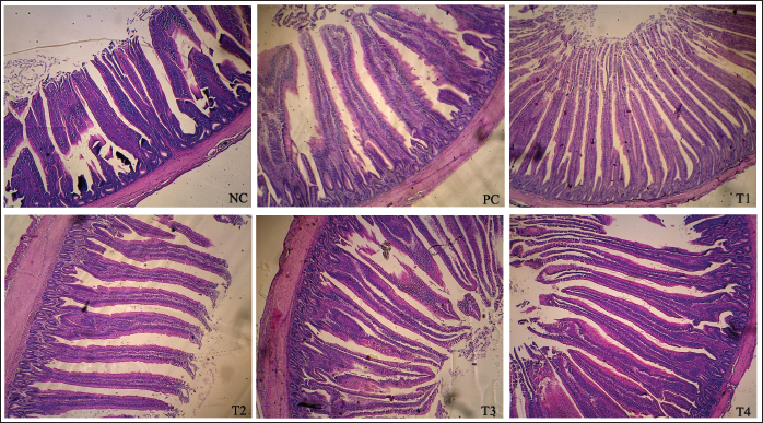 Fig. 1. Microstructure of the intestinal villi in the broiler chicken jejunum supplemented with nanoencapsulated Peronema canescens Jack extract in drinking water. NC (no treatments); T1 (8.5 ml/l PcNP); T2 (17 ml/l PcNP); T3 (34 ml/l PcNP); T4 (68 ml/l PcNP); PC (25 mg/l zinc bacitracin) Table 6. Jejunum morphometrics of broiler chickens supplemented with nanoencapsulated Peronema canescens Jack leaf extract in drinking water.