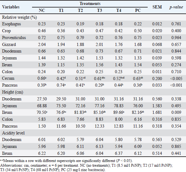 Digestive tract characteristicsNo significant differences were found in the relative weights of the esophagus, crop, proventriculus, gizzard, duodenum, jejunum, ileum, and colon, as well as in the lengths of the duodenum, jejunum, colon, and pancreas, or the acidity of the duodenum, jejunum, and ileum, between the PcNP supplementation and control groups (Table 5). However, the ileum length increased with the supplementation of 68 ml/l PcNP compared with the other groups (P < 0.001). The cecum yield was greater on chickens without treatment (P < 0.05), whereas the pancreas yield increased with the administration of 8.5 ml/l PcNP in broiler chicken drinking water (P < 0.05). Table 5. Digestive tract characteristics of broiler chickens supplemented with nanoencapsulated Peronema canescens Jack leaf extract in drinking water.